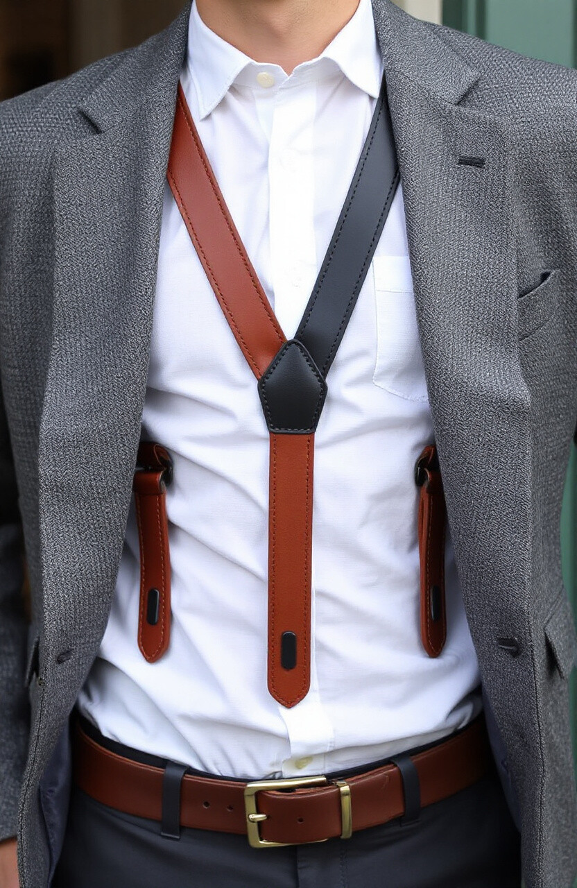 Dark gray leather suspenders are a chic and modern alternative to black. They offer a subtle yet sophisticated look, ideal for office wear or formal events. Pair them with pastel shirts for a refined contrast.