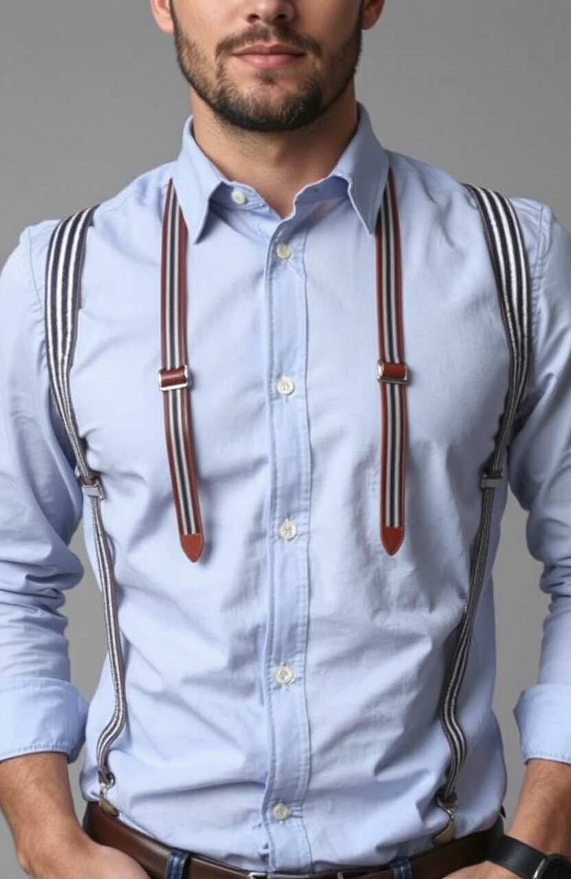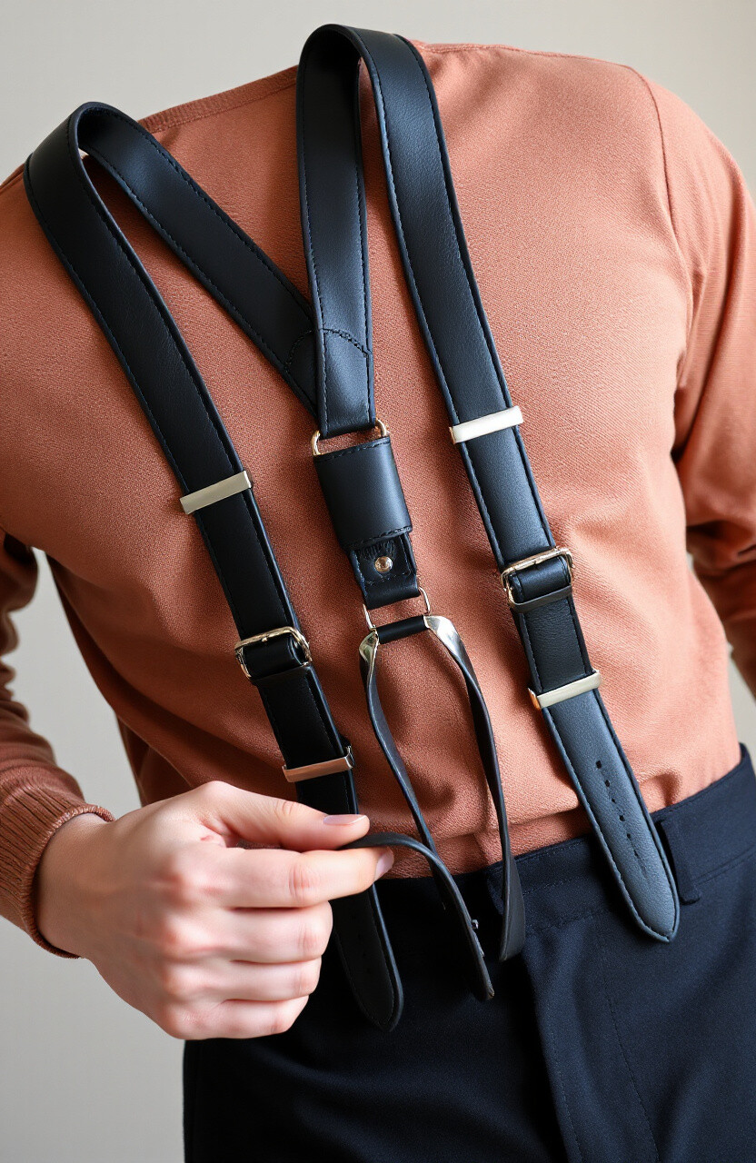 Striped leather suspenders bring a playful twist to your outfit. They’re perfect for casual days when you want to add a bit of personality to your look. Pair them with solid-colored shirts to let the stripes stand out.