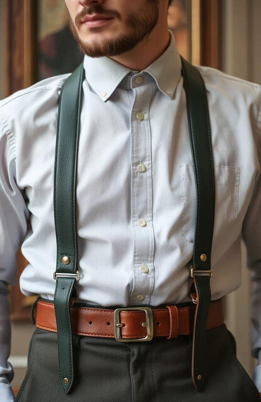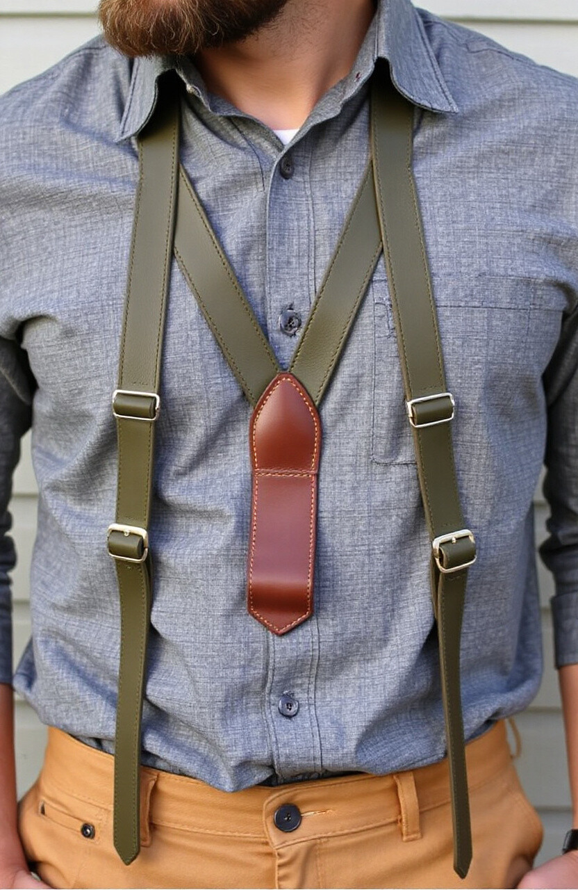 Olive green leather suspenders offer a unique color choice that’s both earthy and stylish. They’re perfect for autumn outfits, adding warmth and charm. Pair them with neutral tones for a balanced look.