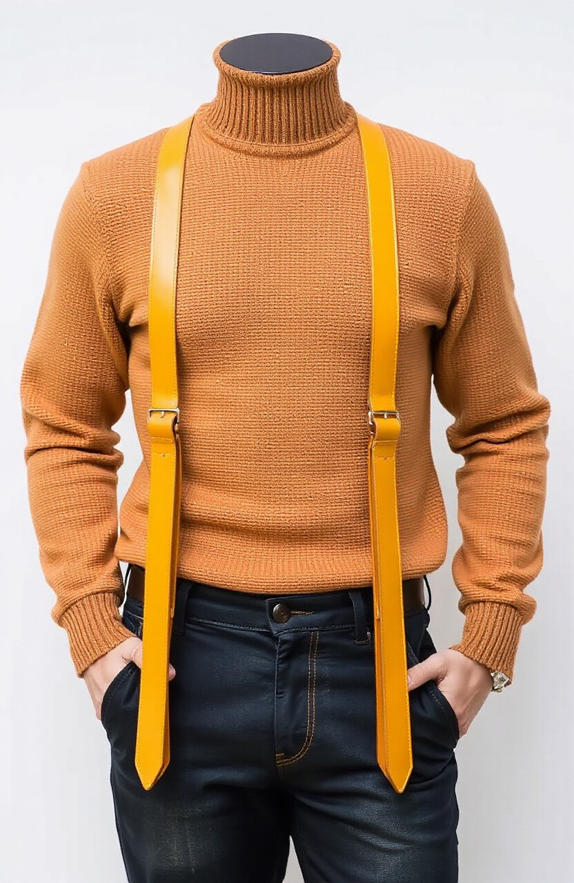 Yellow ochre leather suspenders offer a warm and earthy color that’s perfect for autumn outfits. They add a touch of richness and warmth to your look, pairing beautifully with dark or neutral tones.