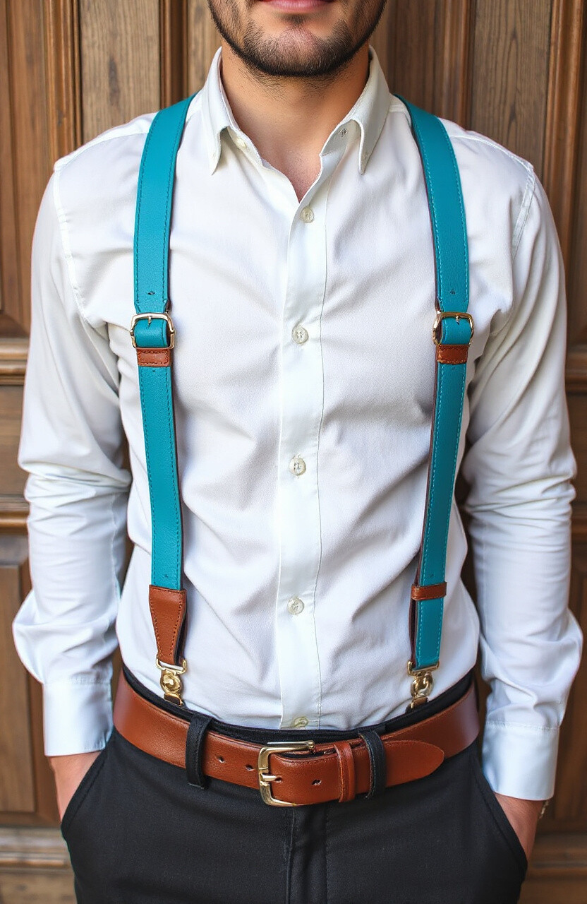 Turquoise leather suspenders add a splash of vibrant color to your ensemble. They’re perfect for summer outings or when you want to make a bold statement. Pair them with a white shirt for a striking contrast.