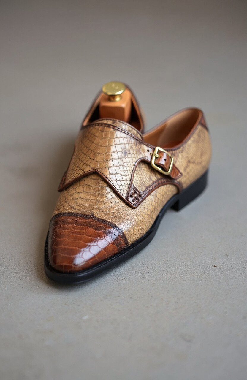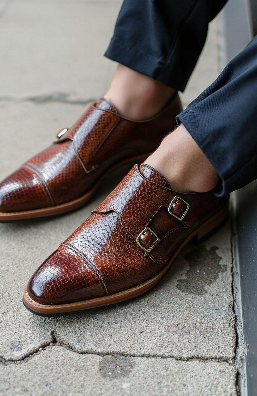 Lizard skin patterns add a touch of exotic flair to monk straps. Perfect for those who love unique textures.