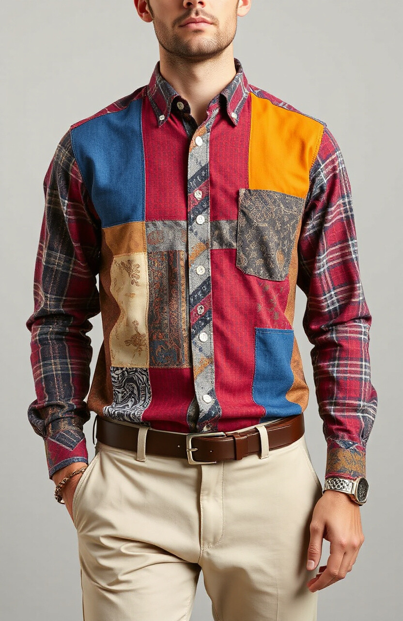 Pair with neutral trousers to balance the complexity. Patchwork shirts are fun and unique, reflecting a playful and adventurous personality.