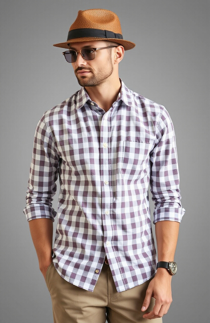 Pair it with solid trousers or jeans to keep the focus on the shirt. Gingham is timeless and works well for both young and mature men. Add a fedora for a stylish touch.