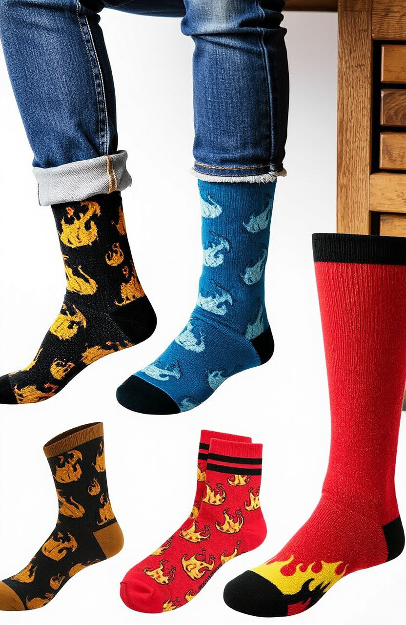 Flame patterns bring a fiery touch to your socks. They’re perfect for those who love to stand out and make a bold statement.