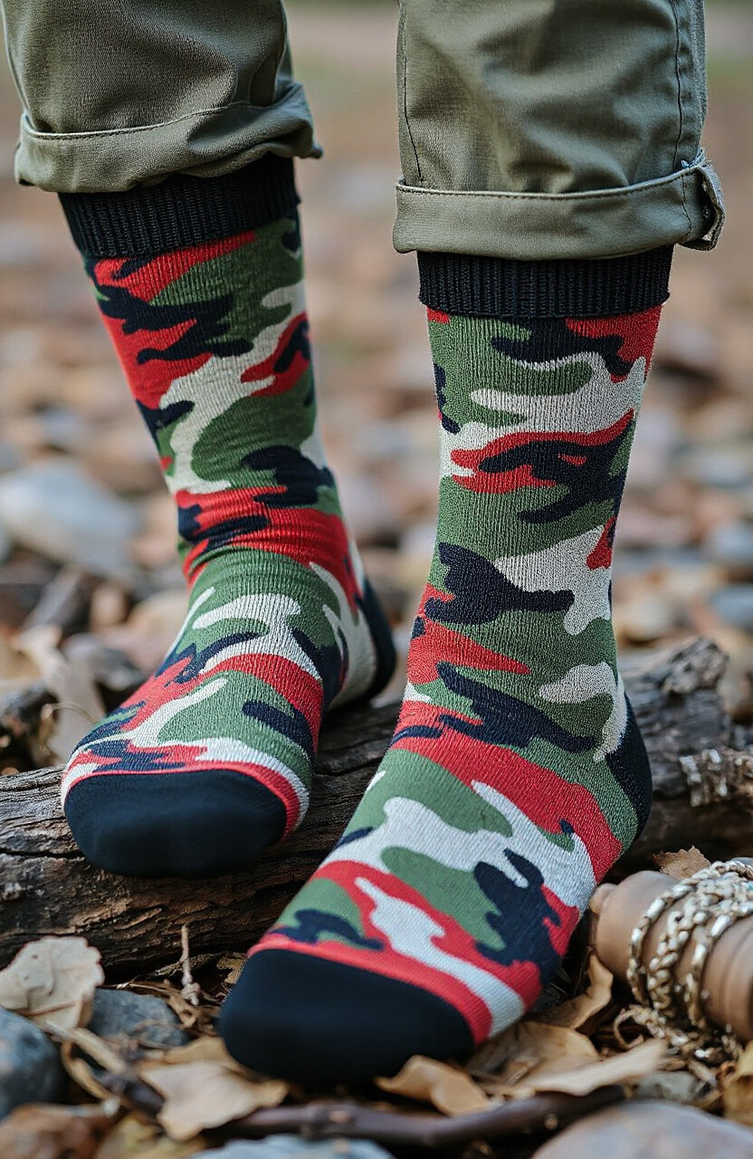 Camouflage socks go beyond the traditional army green, offering a range of colors for a modern twist. They’re a nod to adventure and the outdoors.