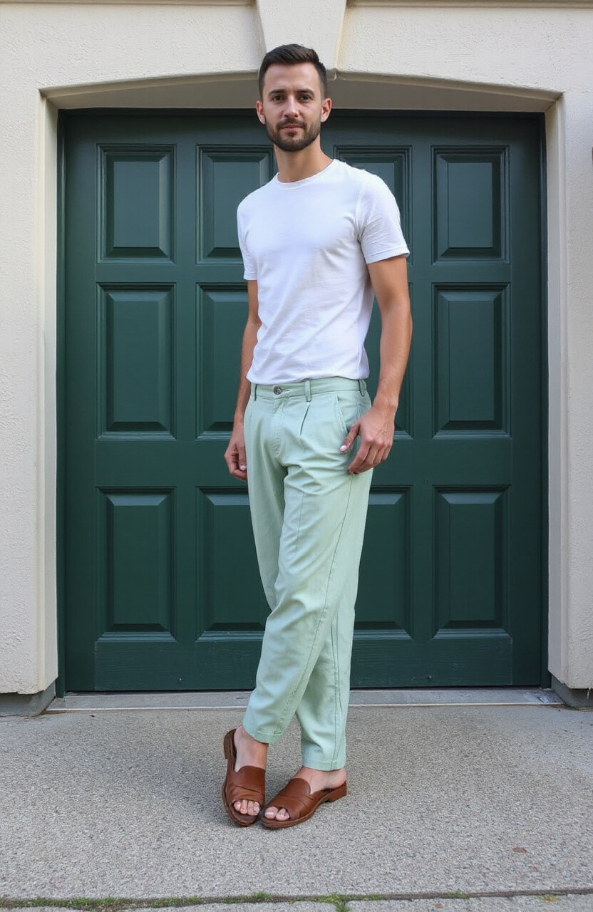 Mint green pleated pants bring a touch of freshness and fun. They’re perfect for spring or summer.