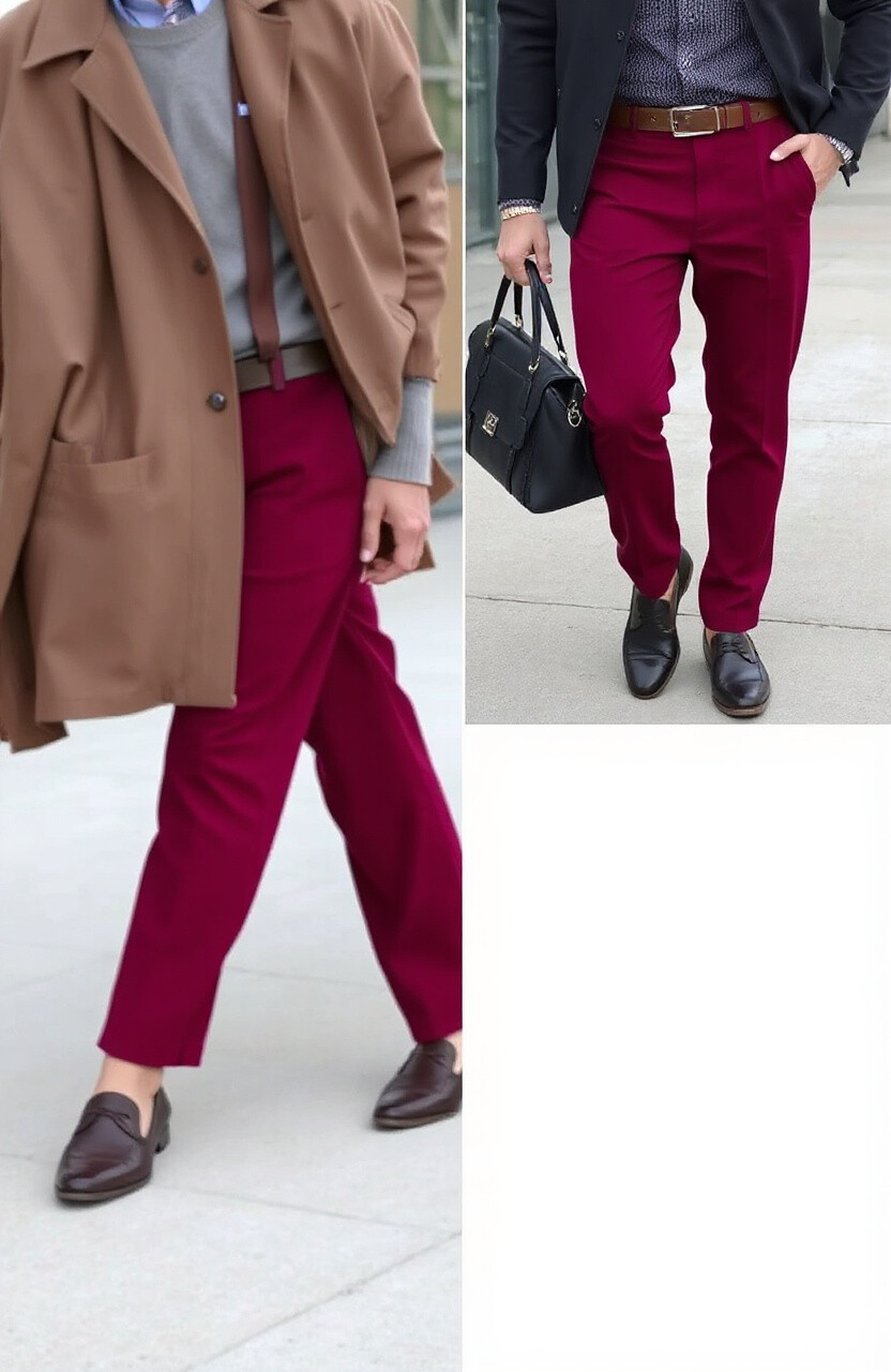 Maroon pleated pants are rich and regal. They add depth and warmth to your wardrobe.