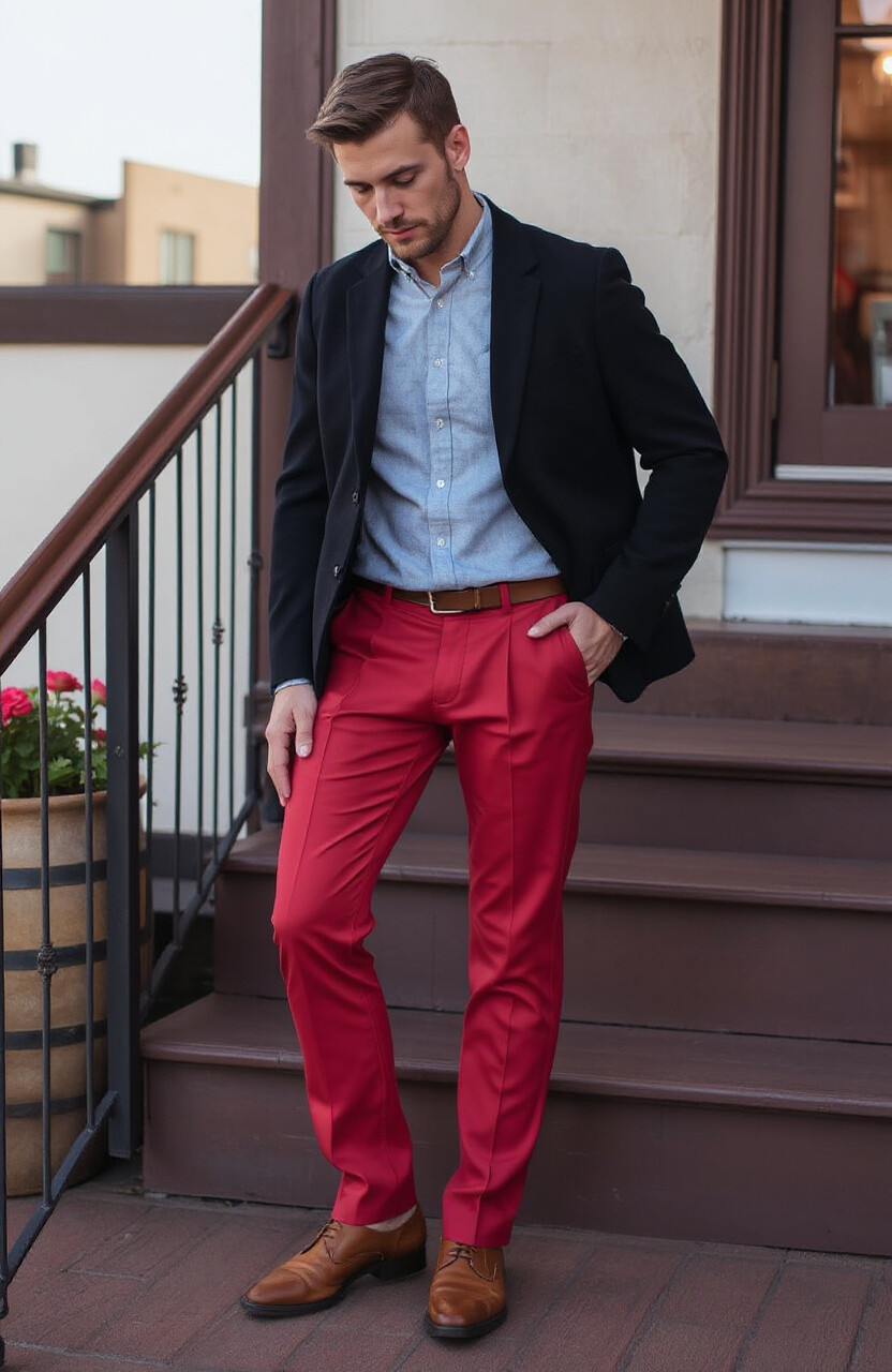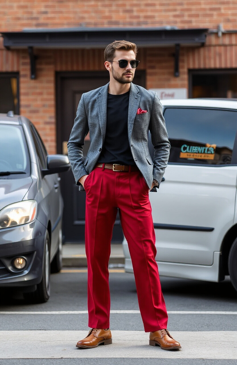 Crimson pleated pants are bold and eye-catching. They add a pop of color to any outfit.