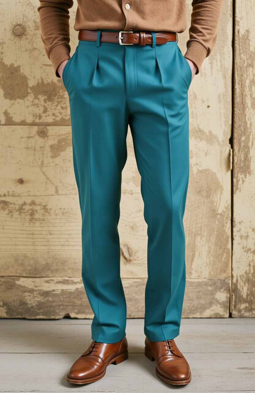 Teal pleated pants are rich and vibrant. They offer a unique shade that’s both striking and versatile.