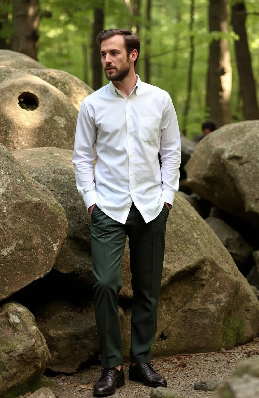 Forest green pleated pants are deep and earthy. They bring a touch of nature to your look.