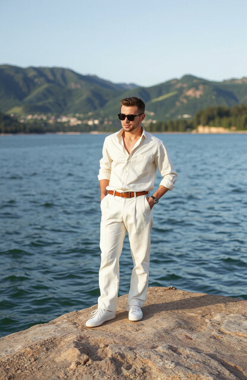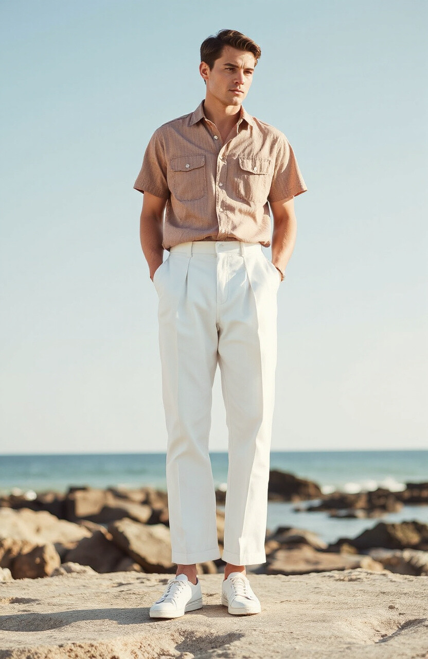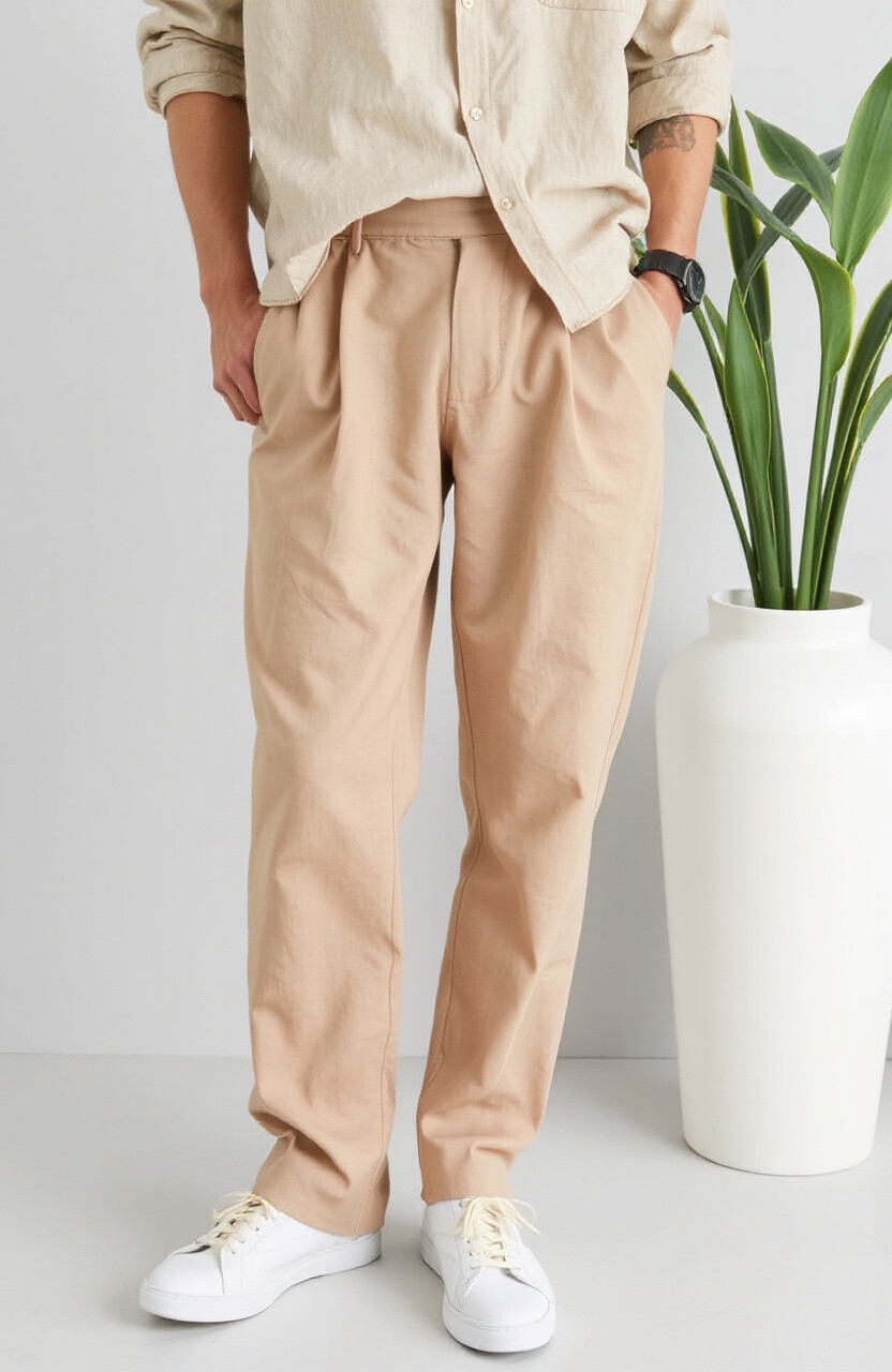 Beige linen pleated pants offer a breezy feel for warmer days. Their light fabric ensures comfort without sacrificing style.