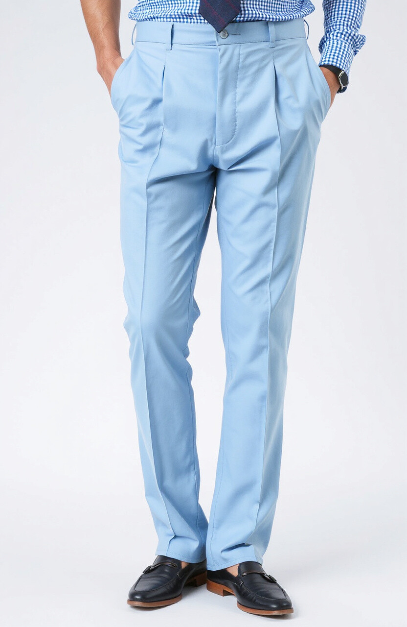 Sky blue pleated pants bring a touch of tranquility. They’re perfect for a sunny day out.