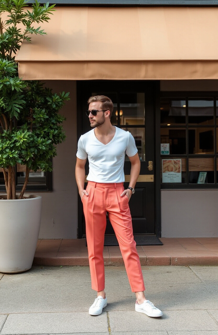 Coral pleated pants bring a touch of warmth and fun. They’re perfect for spring or summer.