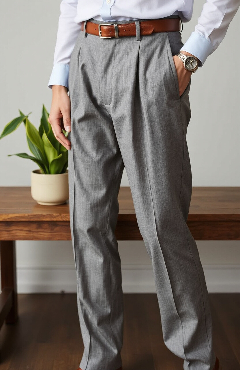 Cozy and classy, grey wool pleated pants are ideal for the cooler months. They keep you warm while ensuring you look sharp.