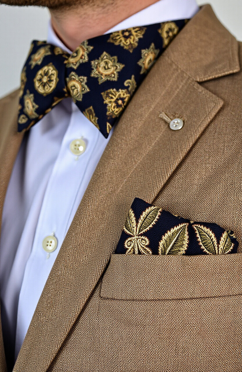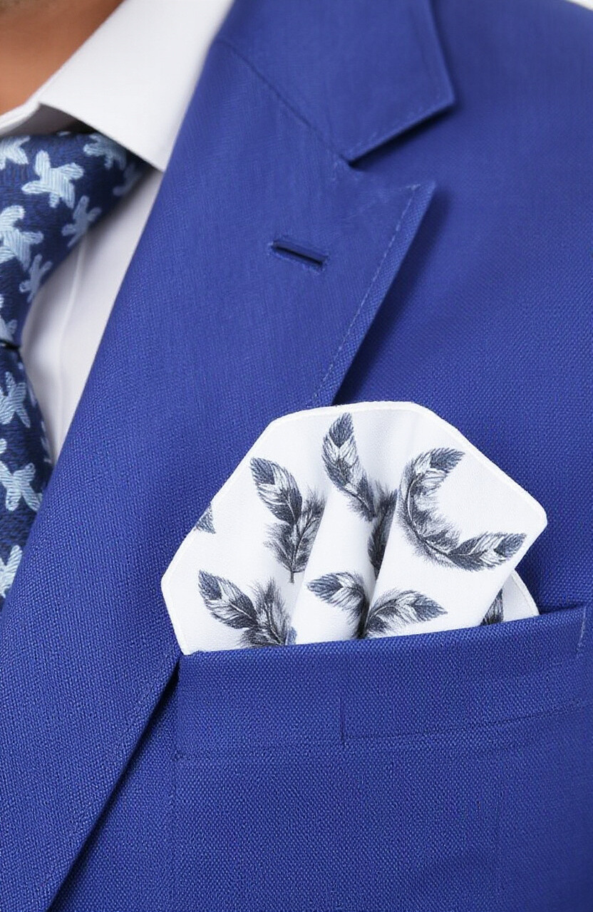 Feather-print pocket squares are light and whimsical. They add a touch of nature to your attire. Perfect for spring and summer looks.
