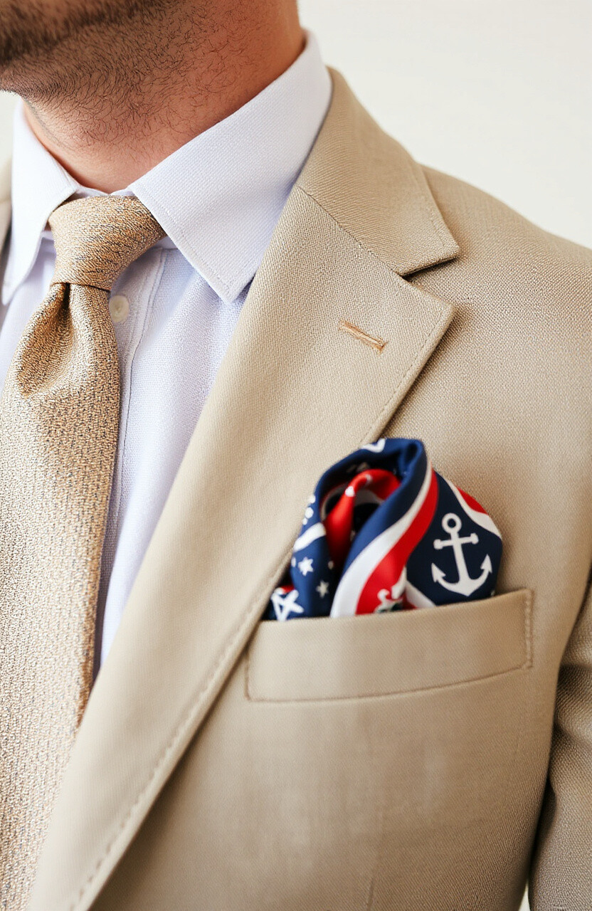 Nautical-themed pocket squares are perfect for summer. They bring a breezy, seaside vibe to your outfit. Ideal for beach weddings or casual gatherings.