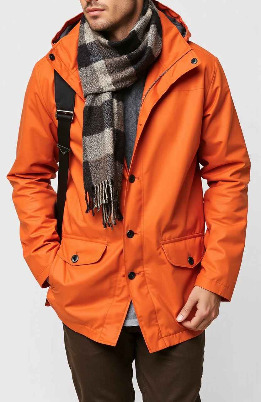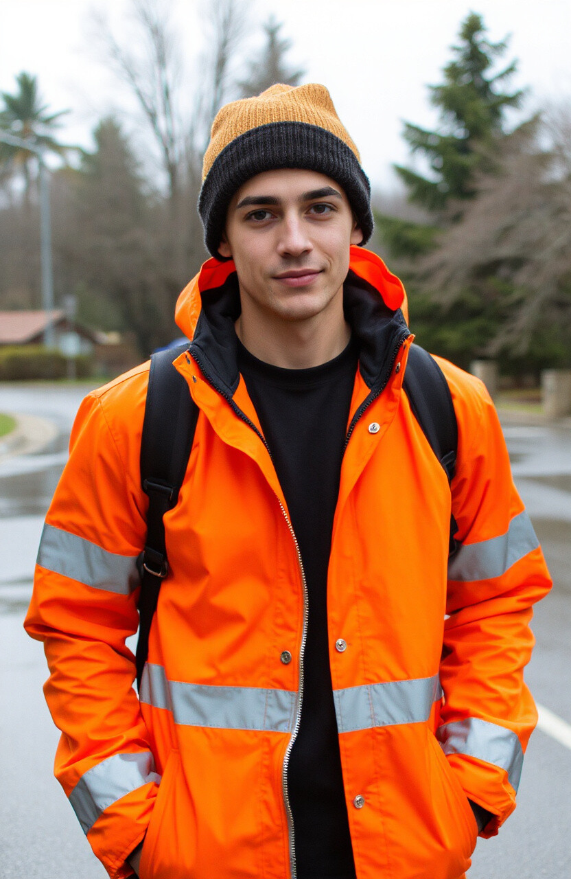 Stay visible and stylish with a bright orange jacket featuring reflective stripes. The bold color is both fun and practical, perfect for ensuring visibility on dark, rainy days.