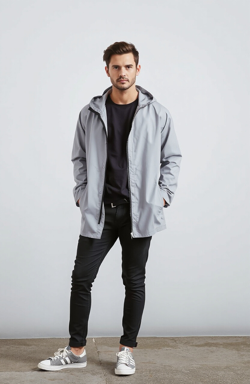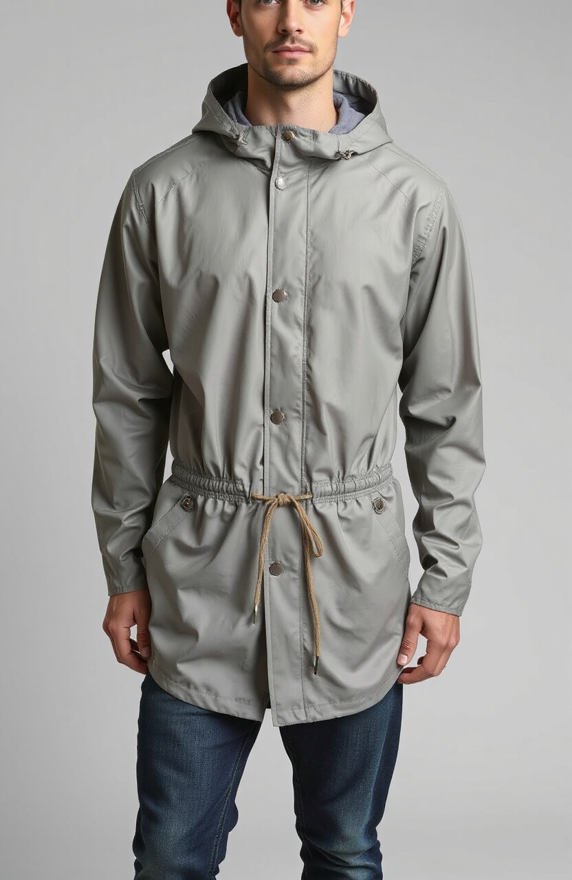 A lightweight grey anorak is the ultimate in versatile rainwear. Its minimalist design is perfect for those who prefer understated elegance. The adjustable drawstring waist offers a customizable fit.