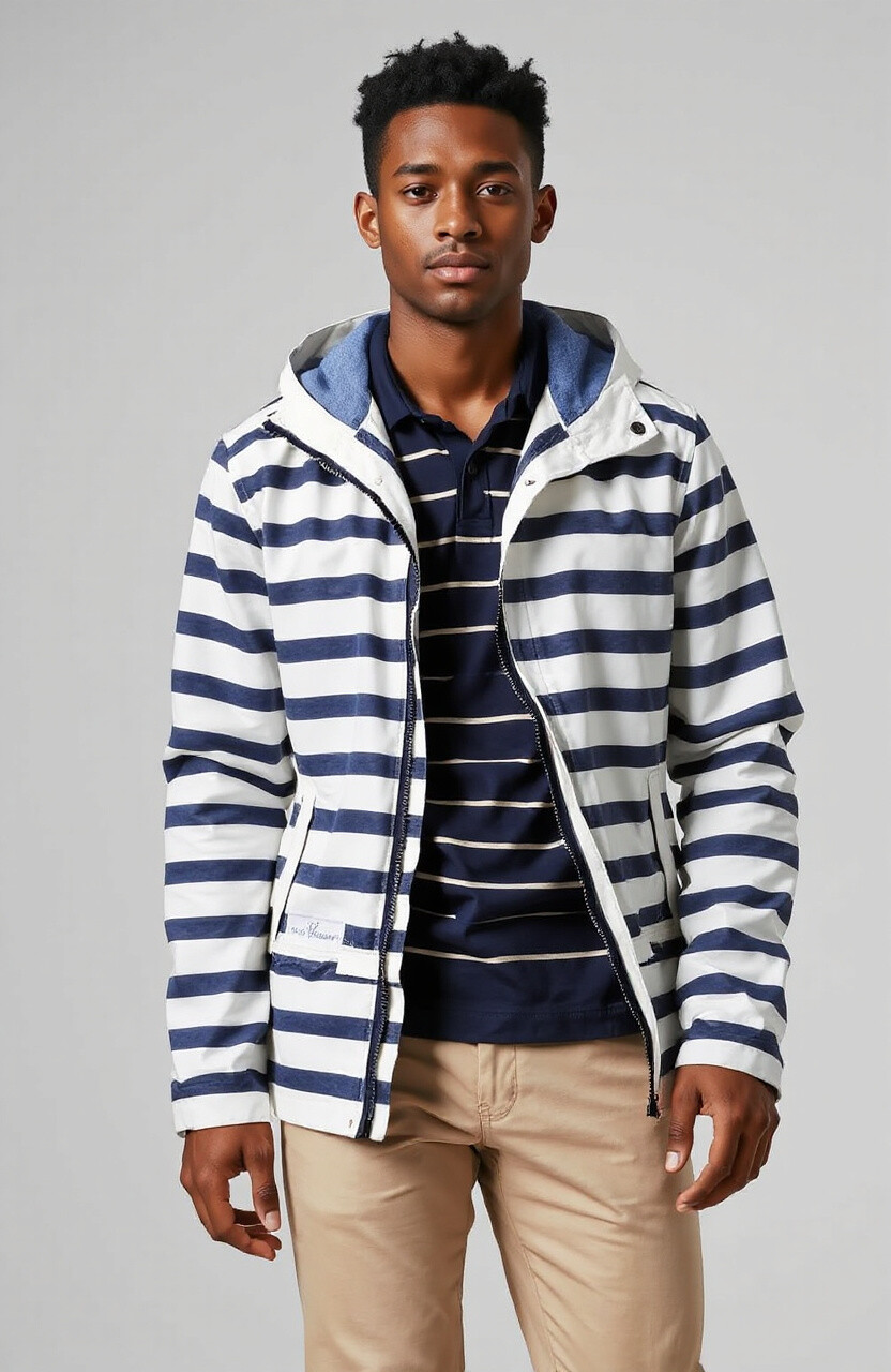 Channel a maritime vibe with a striped nautical jacket. The classic navy and white stripes are timeless and stylish. Its water-resistant material ensures you stay dry.