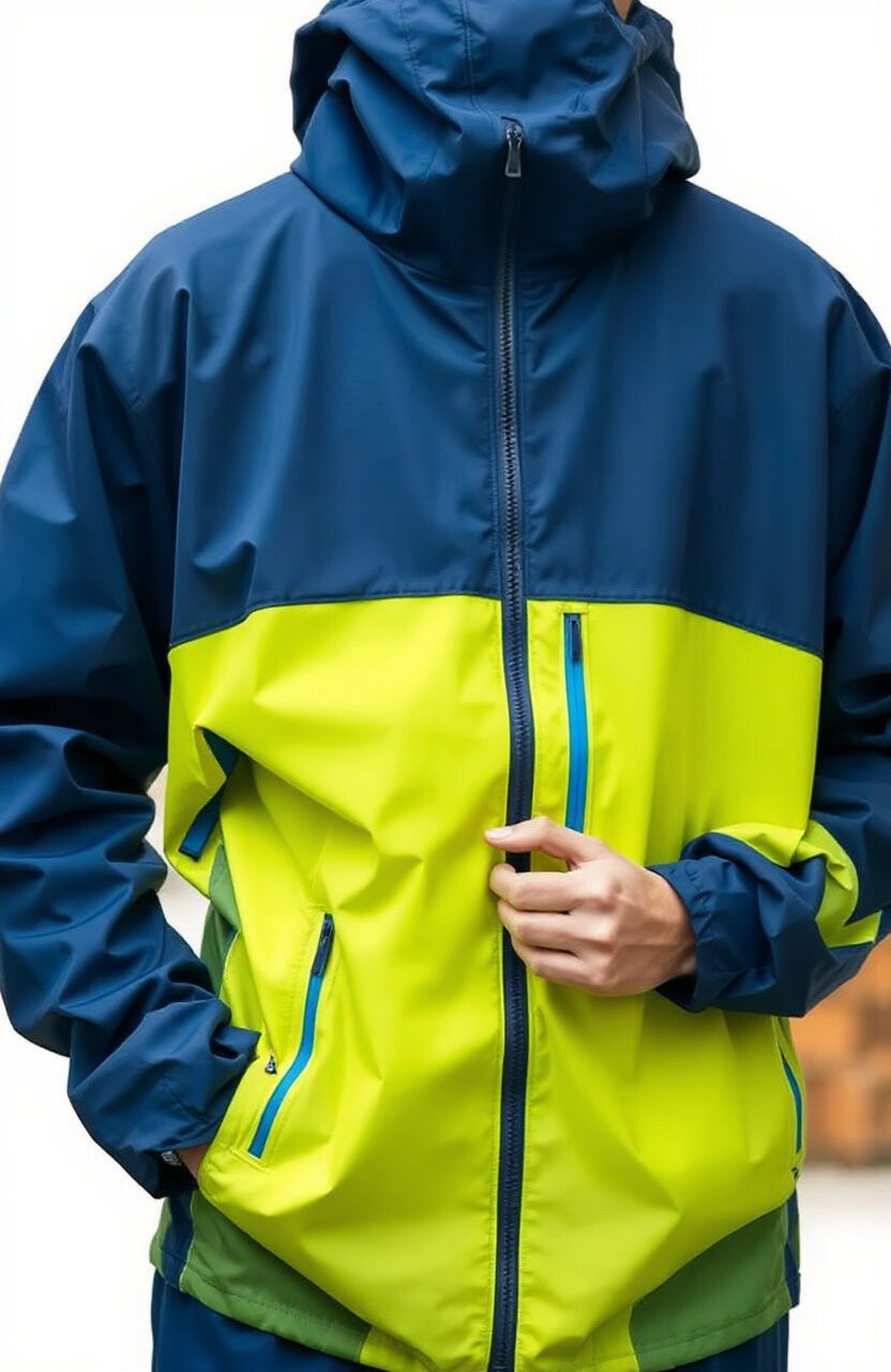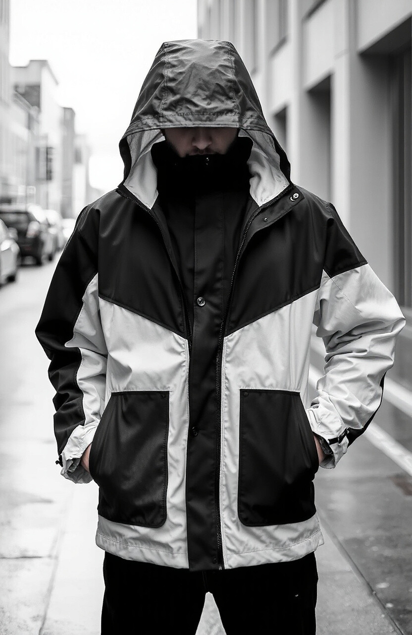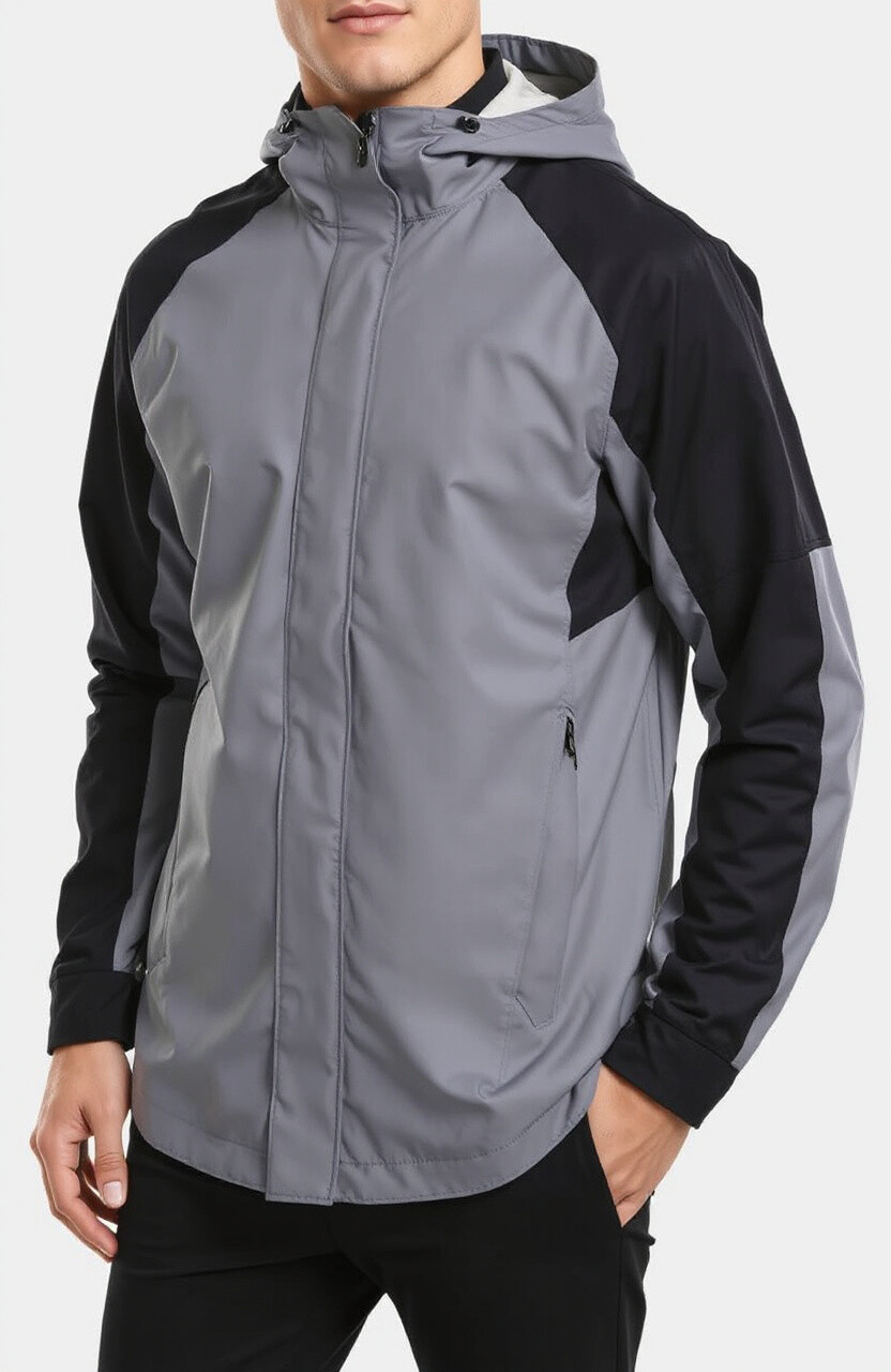 Add some flair to your rainy day attire with a black and grey color block jacket. The contrasting colors create a bold, modern look. Its water-resistant fabric ensures you stay dry in style.