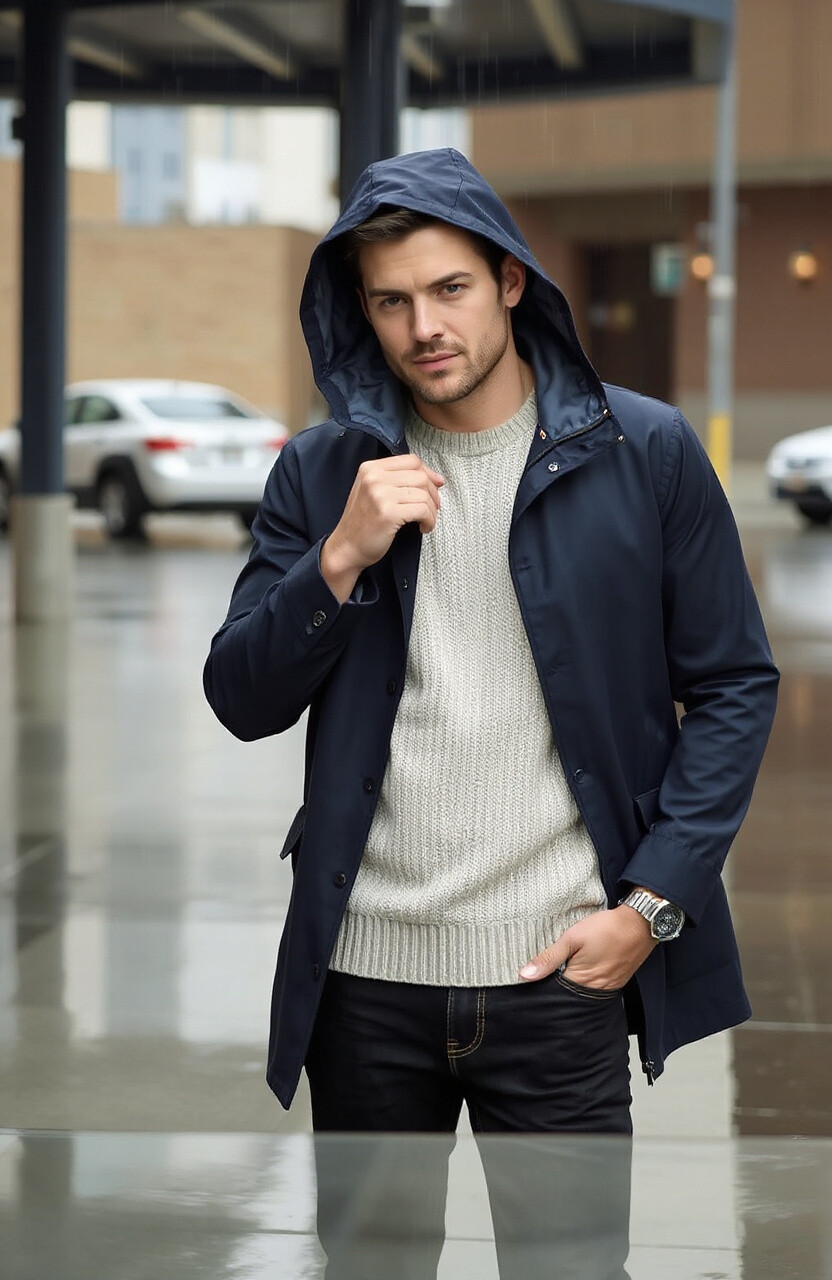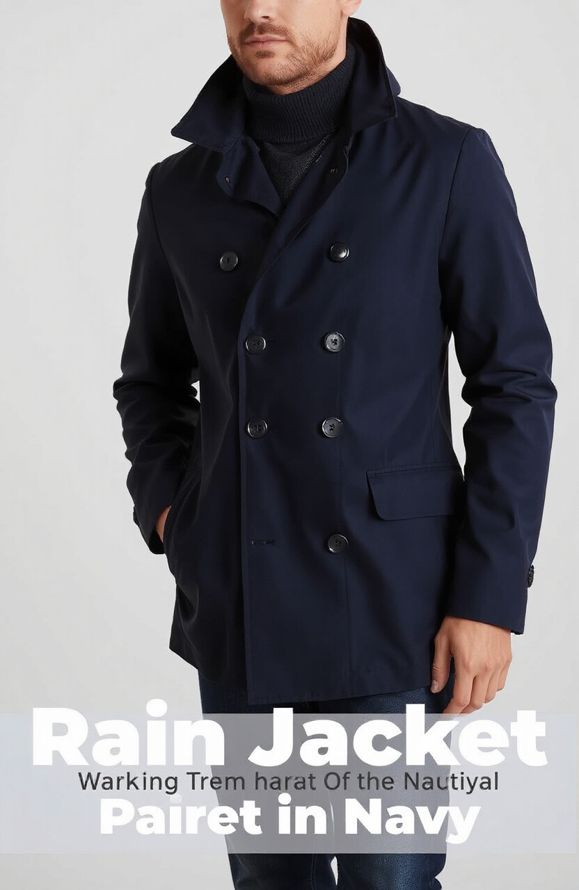 For a touch of nautical elegance, try a peacoat-style rain jacket in navy. The classic double-breasted design is both sophisticated and timeless. Its rich navy hue is versatile and stylish.