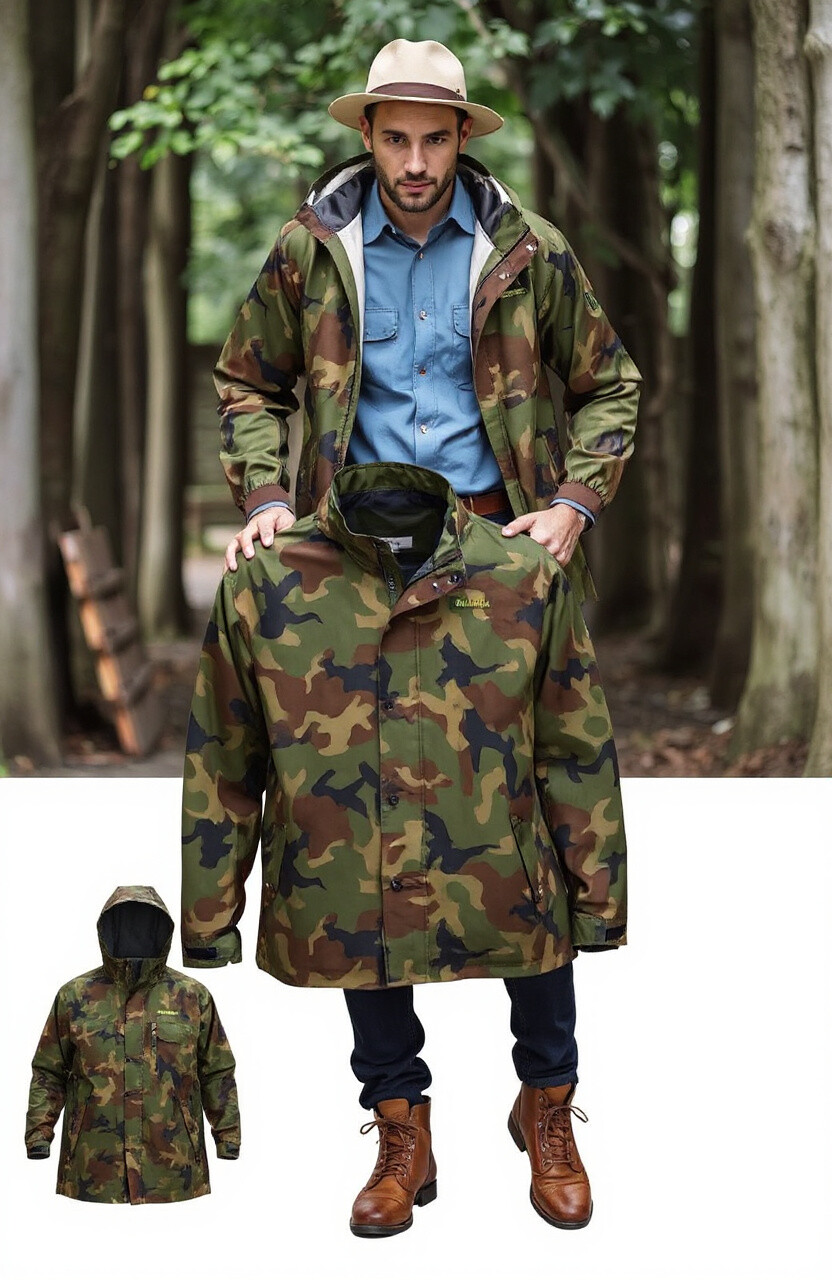 For a touch of adventure, go for a camouflage print jacket. This bold design is ideal for standing out while blending in with nature. The pattern adds a unique edge to traditional rainwear.