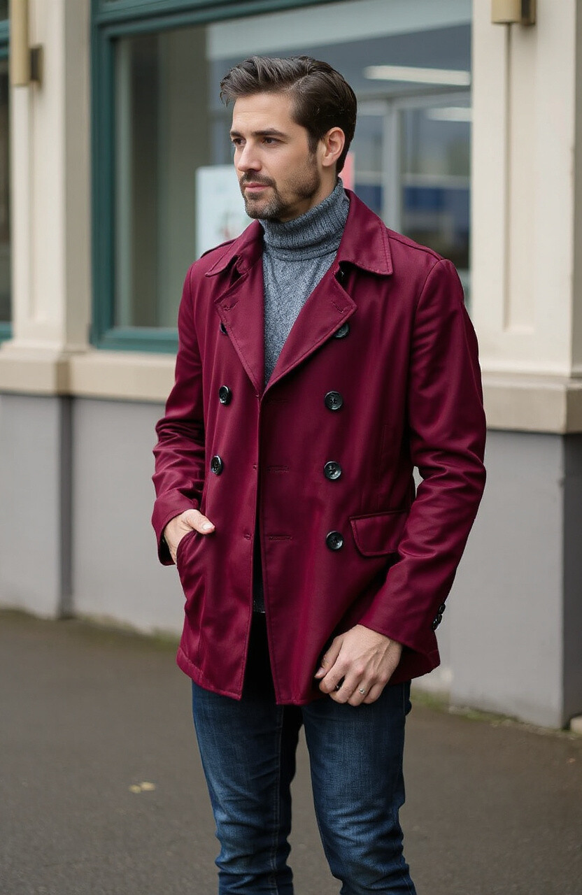 Add a pop of color to your rainy day ensemble with a burgundy peacoat-style jacket. Its rich hue is both sophisticated and eye-catching. The double-breasted design adds a touch of elegance.