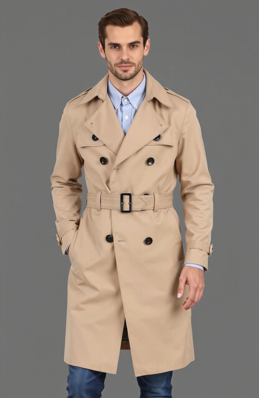 A classic beige trench coat is a timeless piece that never goes out of style. Its neutral shade is versatile, perfect for any occasion. The belted waist adds a touch of refinement.