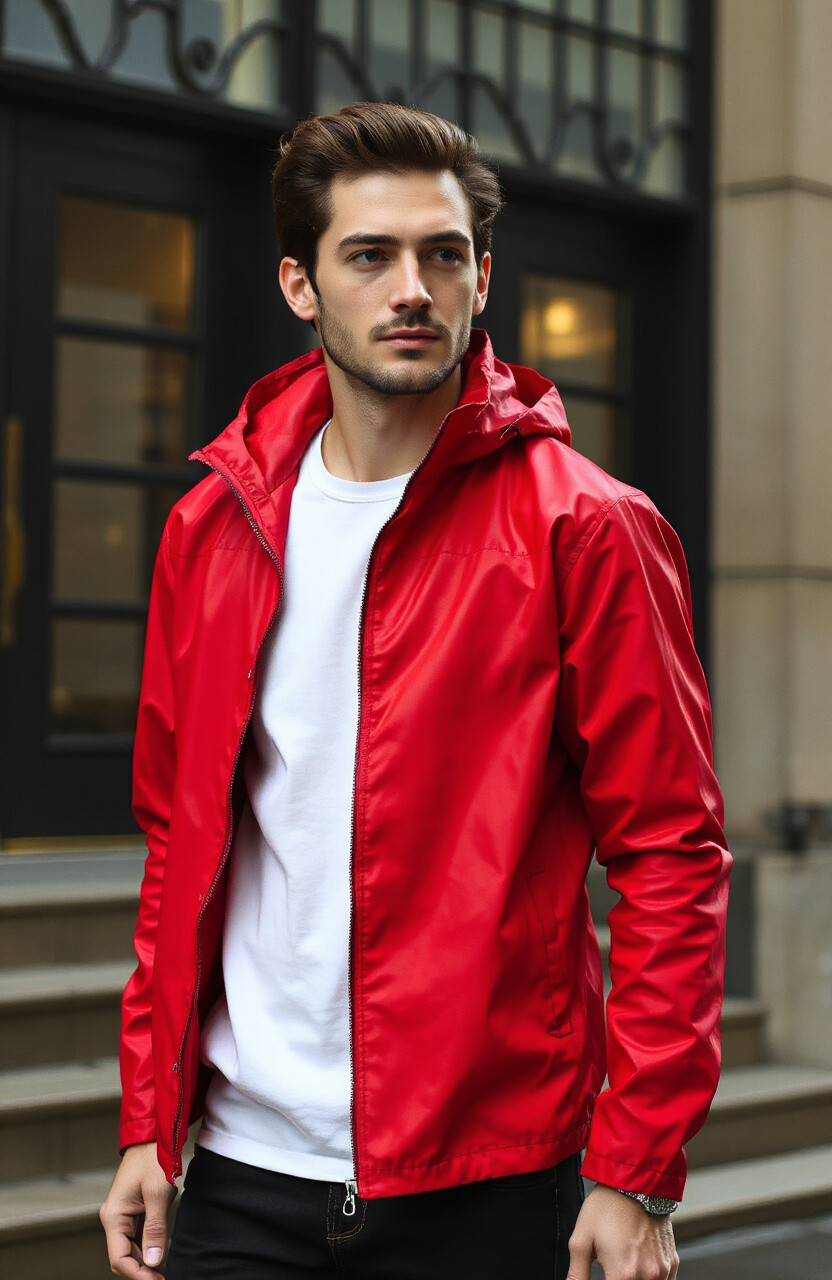 Stay active and stylish with a sporty red windbreaker. The vibrant color is fresh and energetic, perfect for outdoor activities. Its lightweight material makes it ideal for layering.
