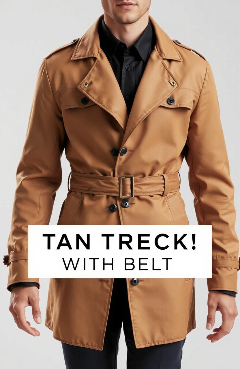 A tan trench with a belt is a classic piece that exudes elegance. Its neutral shade is versatile and timeless, perfect for any occasion. The belted waist adds a touch of refinement.
