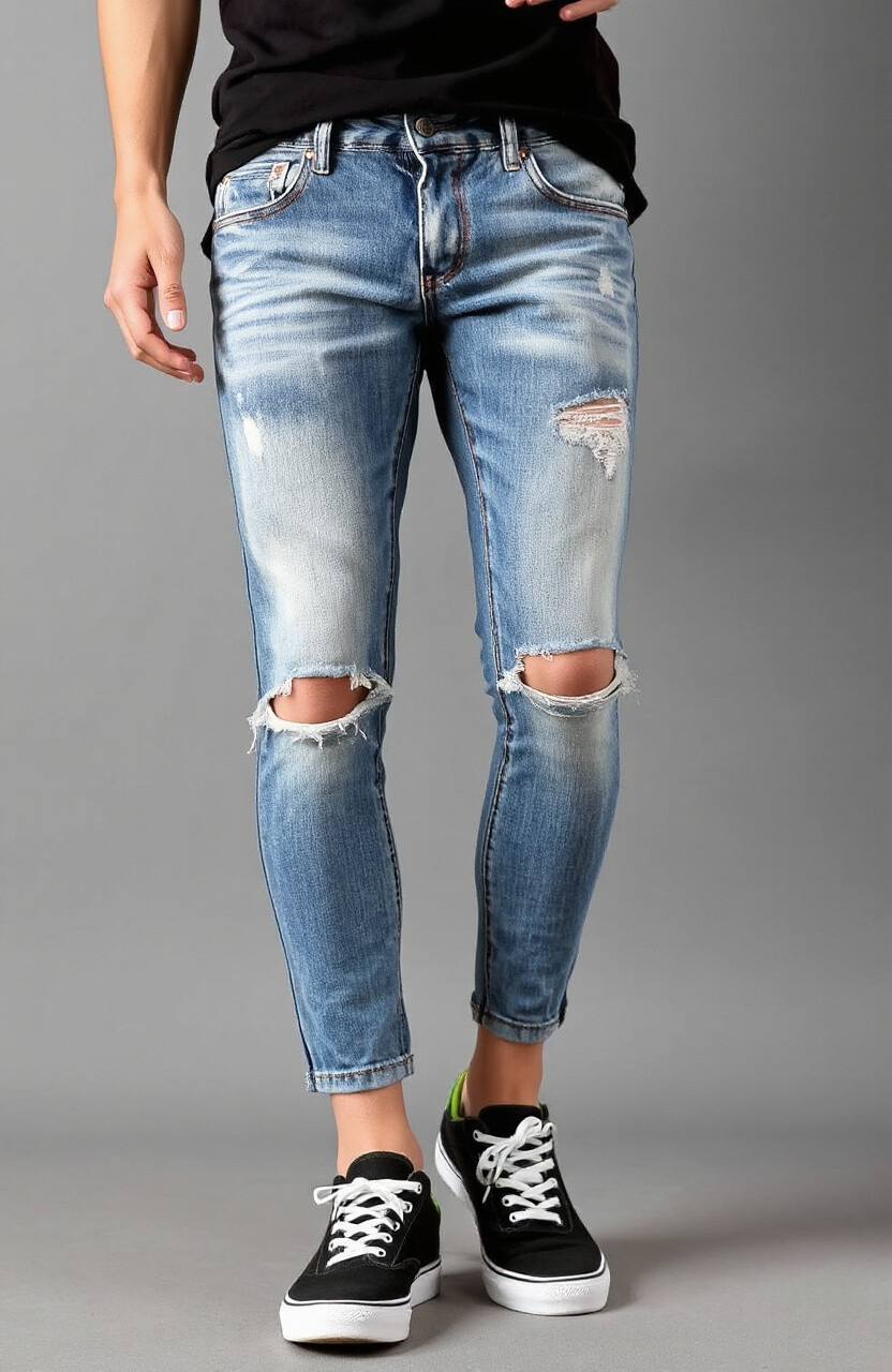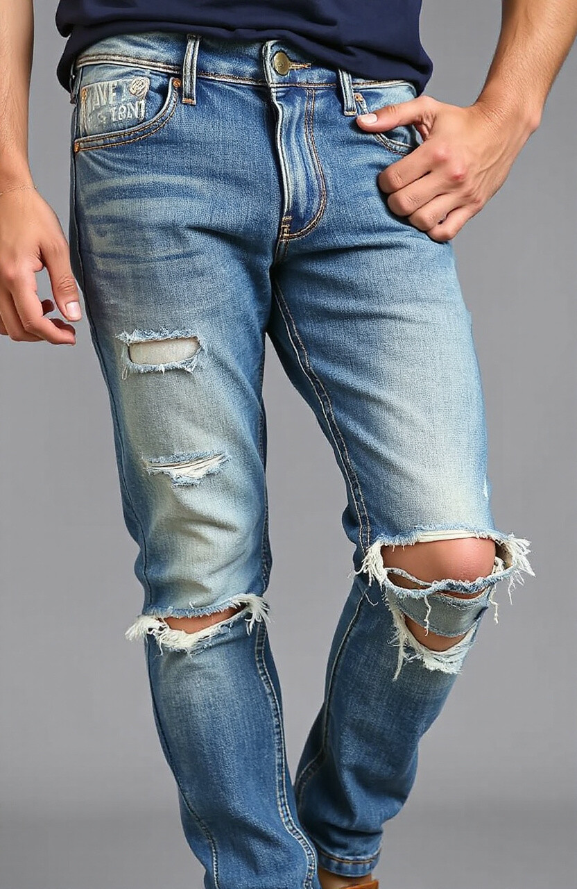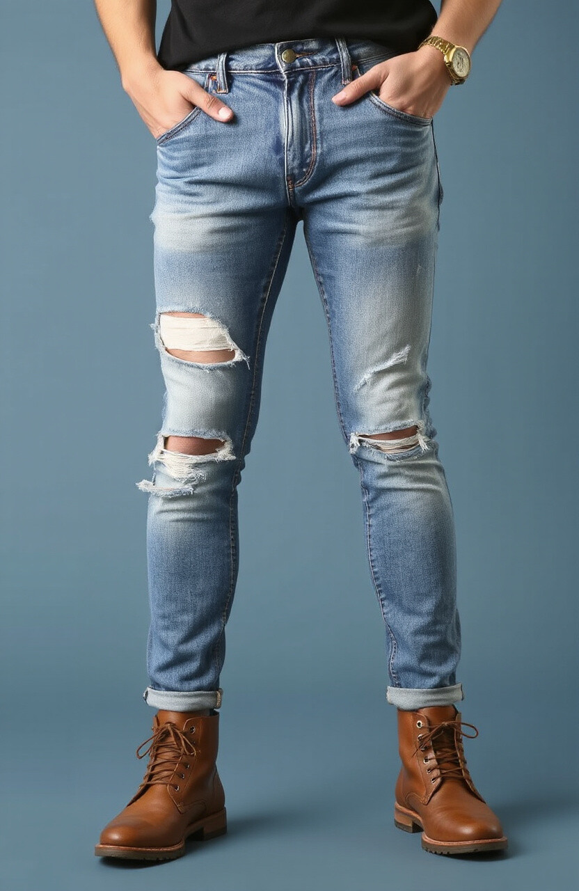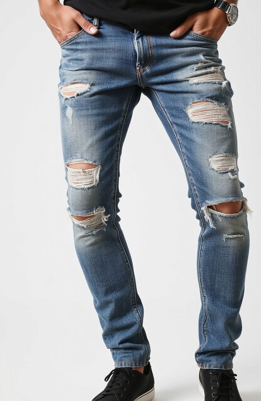 Distressed jeans offer a more rugged look with extensive rips and fraying. They’re perfect for those who love a bold, rebellious style.