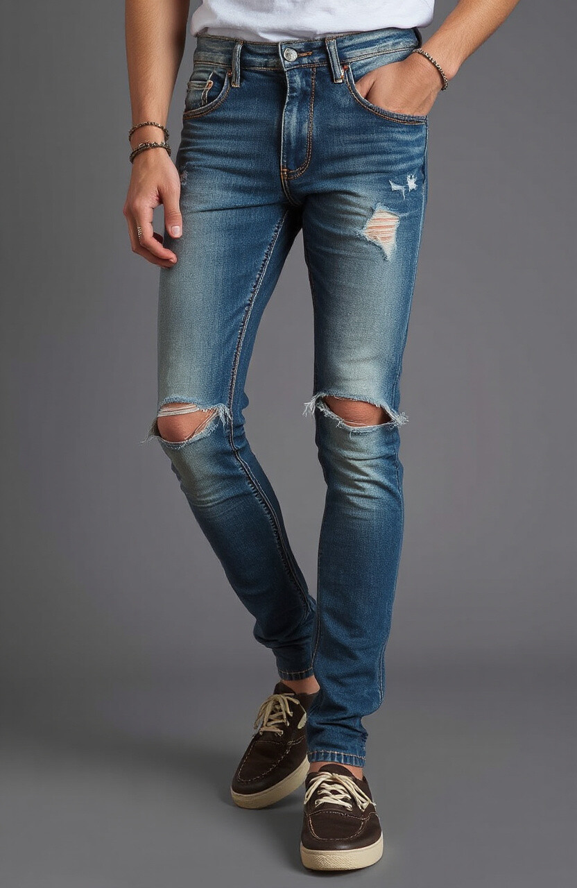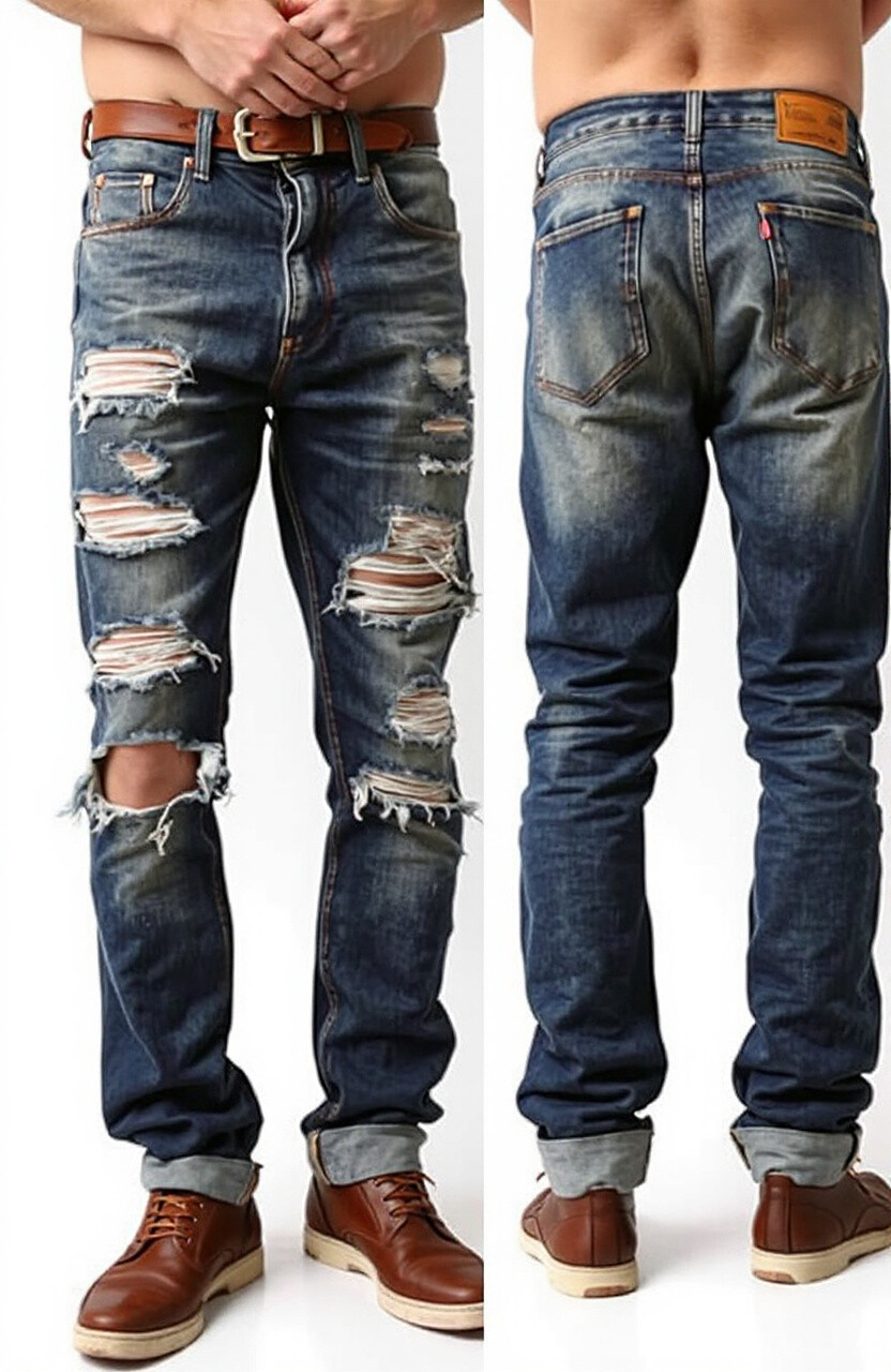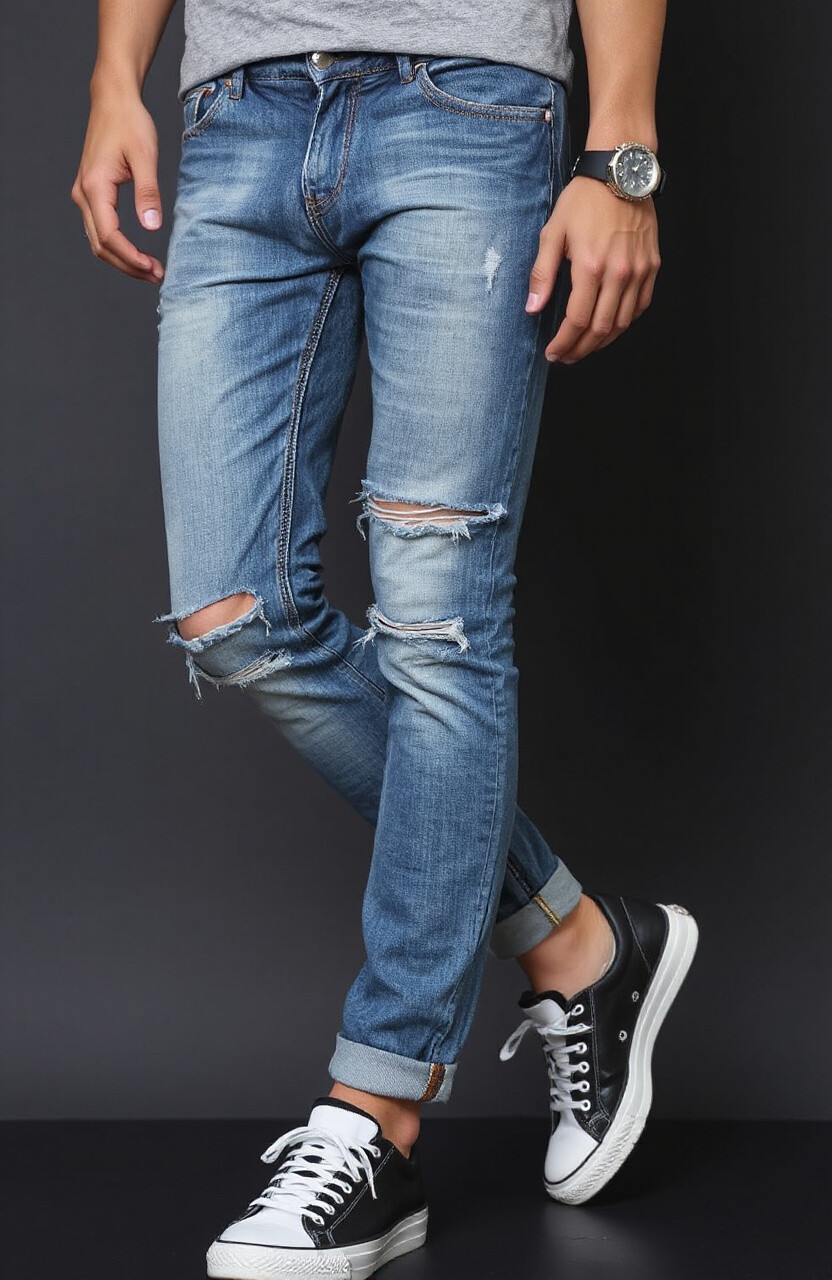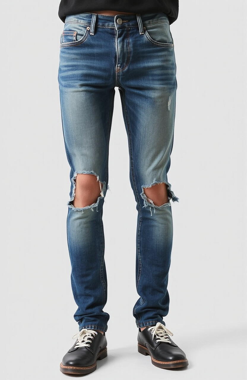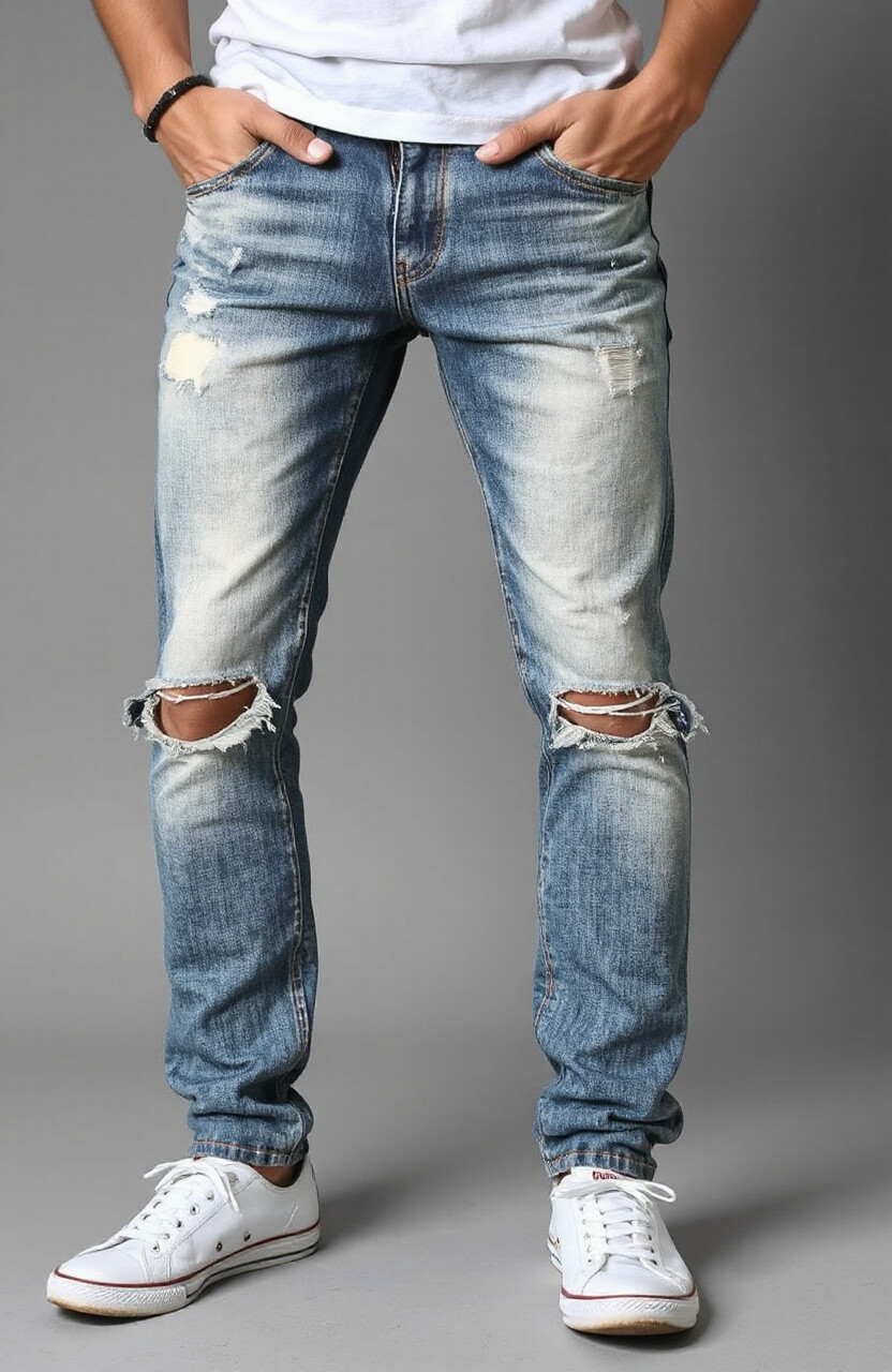 Distressed jeans offer a more rugged look with extensive rips and fraying. They’re perfect for those who love a bold, rebellious style.