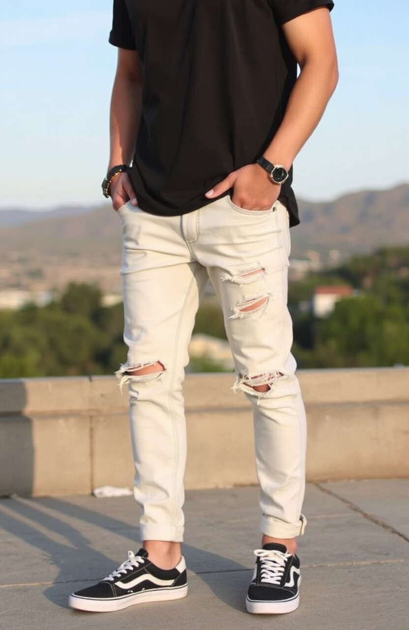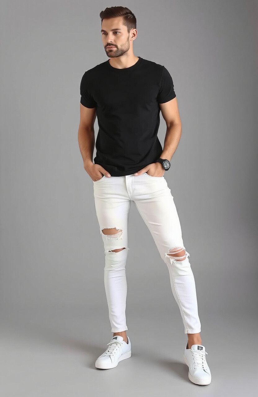 White jeans are a bold choice, and adding rips amps up their style quotient. They’re perfect for summer or any event where you want to make a statement.