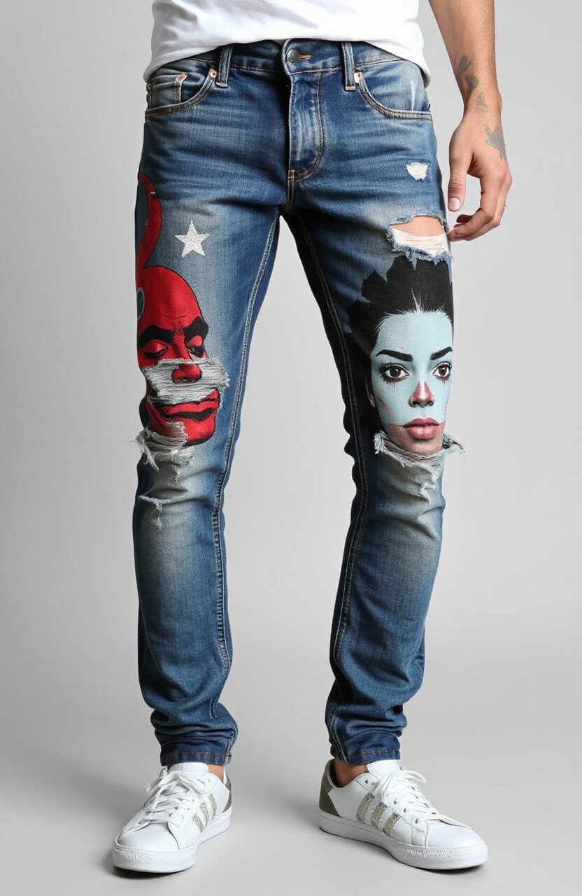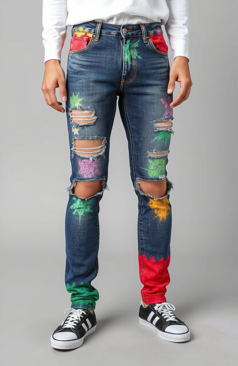 Artistic designs on ripped jeans offer a unique, creative flair. They’re perfect for those who love to express themselves through clothing.