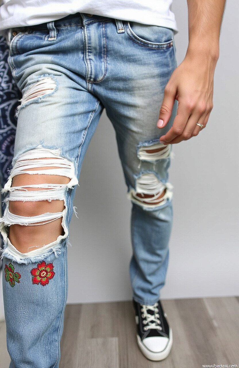 Embroidered details add a personal touch to ripped jeans. They’re perfect for those who love to express their individuality through fashion.