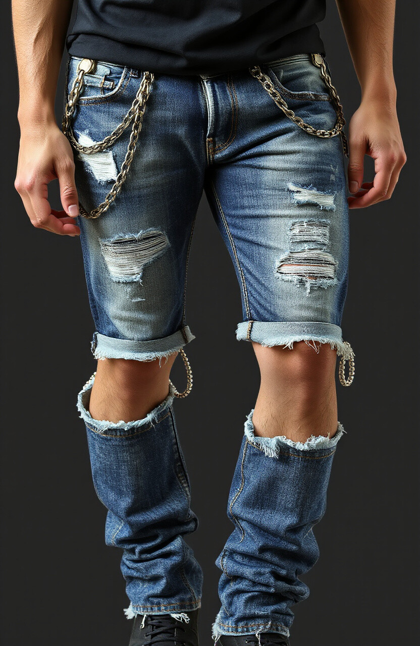 Chain details add an edgy, rebellious touch to ripped jeans. They’re perfect for those who love to push the boundaries of style.