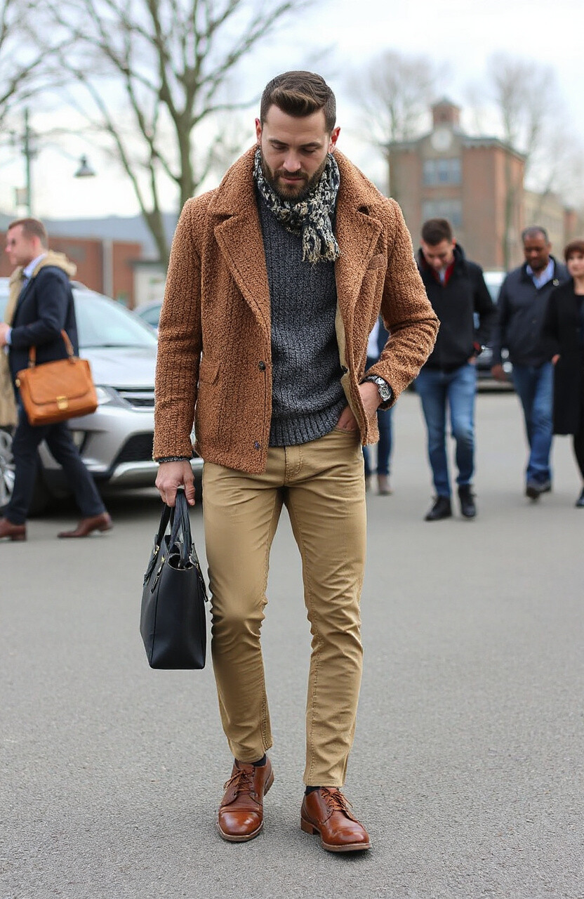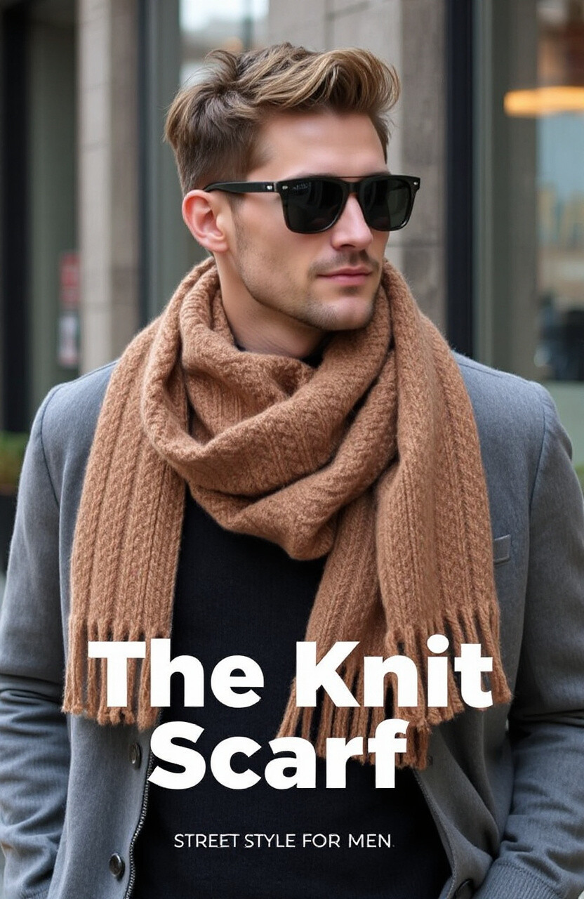 A knit scarf adds texture and warmth to your outfit. It’s perfect for keeping cozy during colder months.