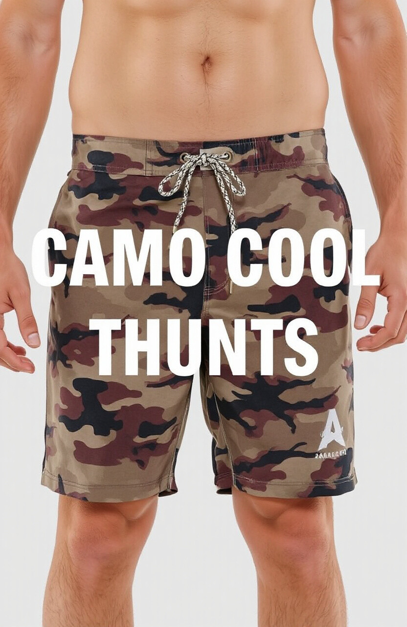 Blend in with nature with Camo Cool swim trunks. The camouflage pattern is both rugged and stylish. Perfect for outdoor enthusiasts.