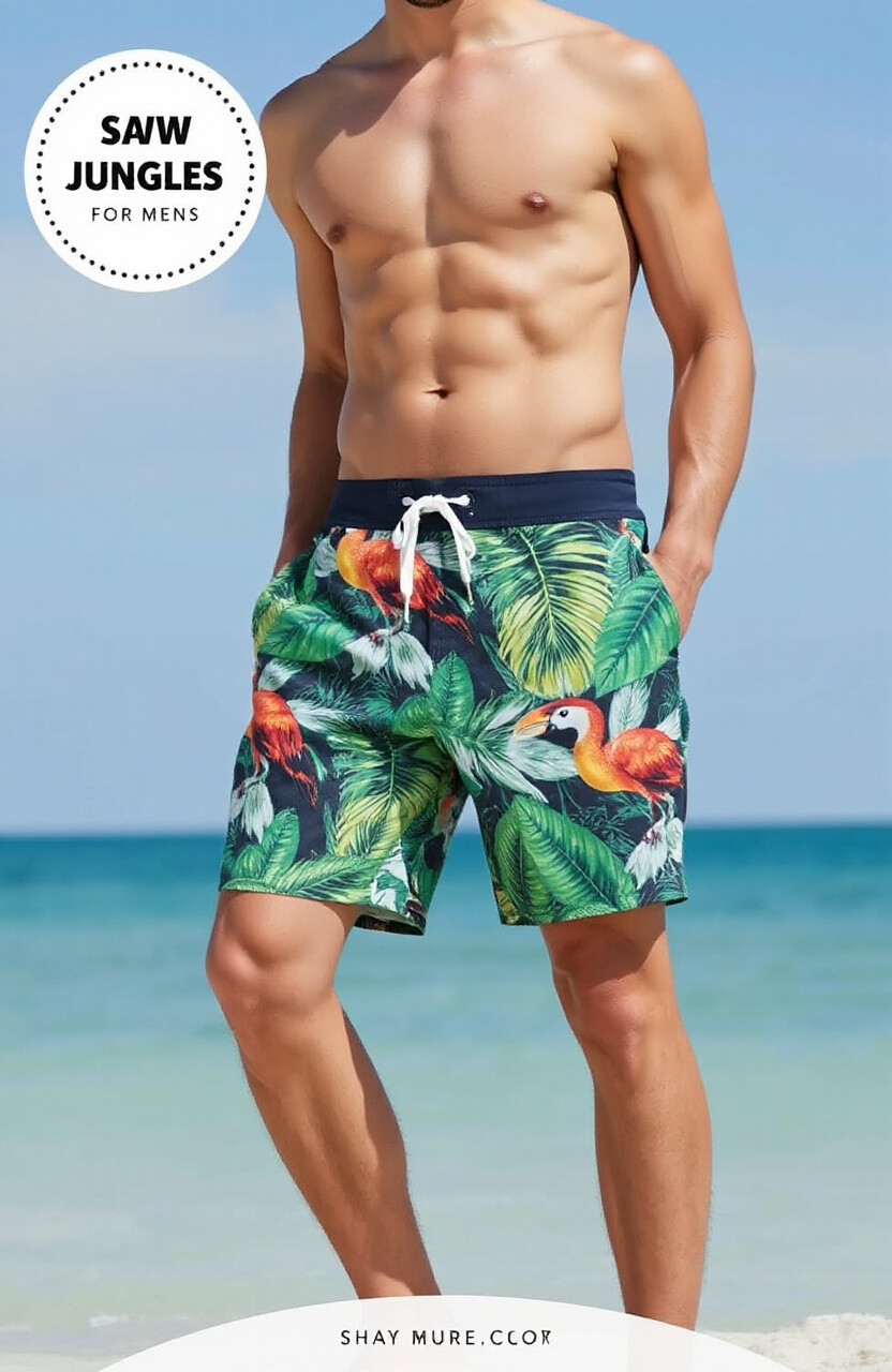Feel the tropical vibes with these swim trunks covered in lush, green leaves. It’s like carrying a piece of paradise with you. Perfect for exotic beach destinations.