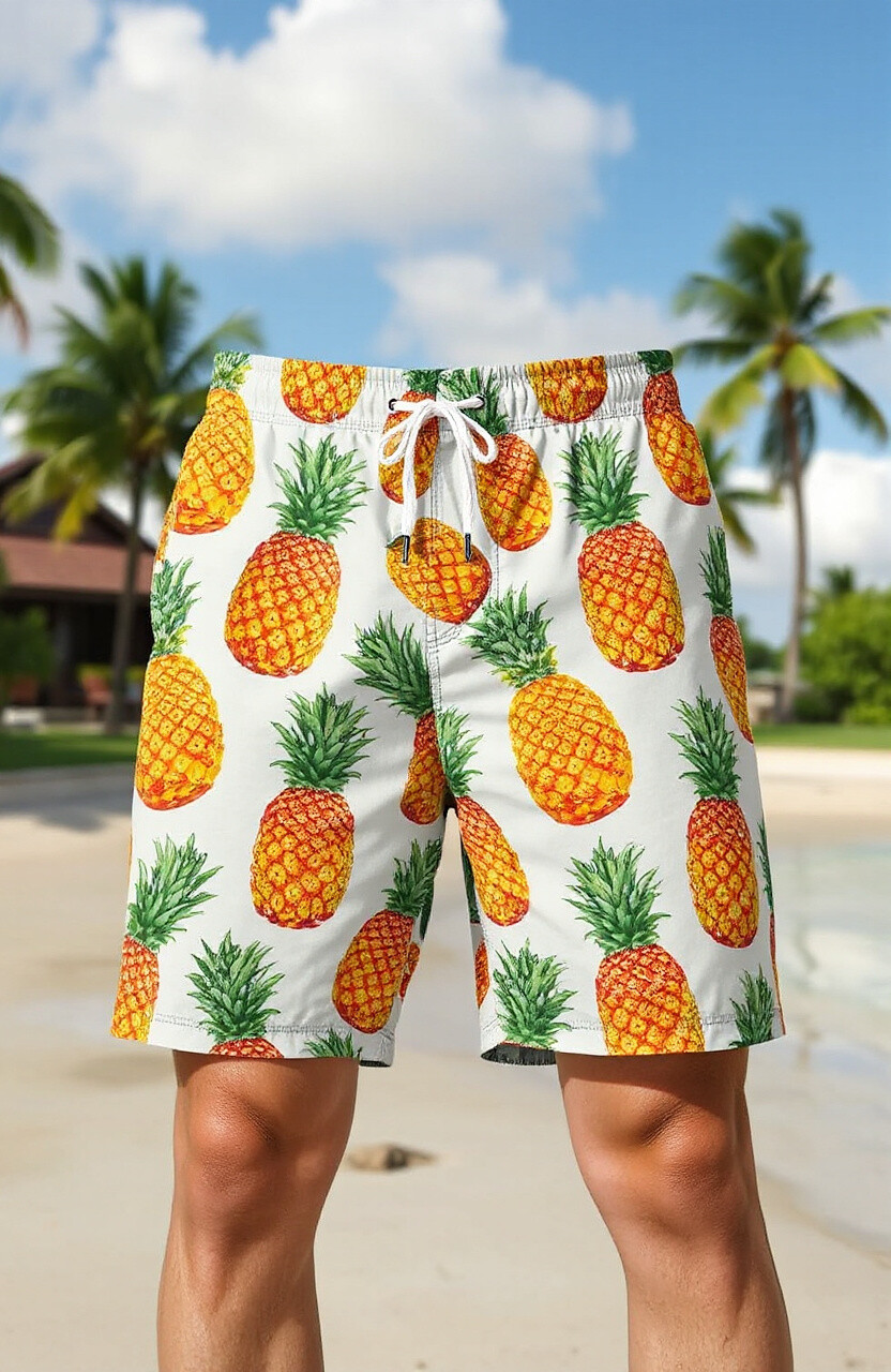 Bring a slice of fun to your swimwear with pineapples scattered all over. It’s quirky and joyful, adding a bit of humor to your beach day. They’re perfect for those who love to keep things light-hearted.