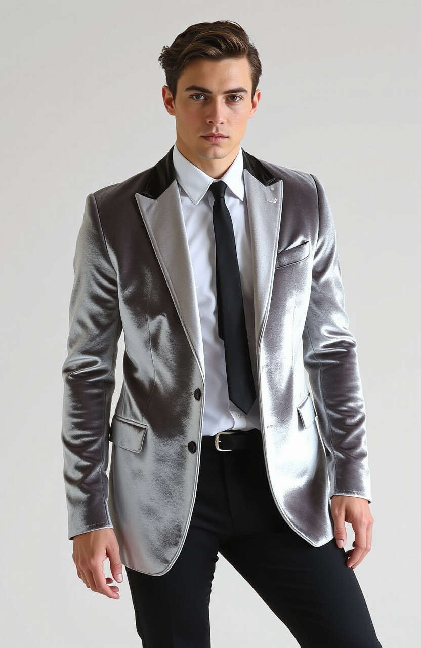 Silver is sleek and modern. This blazer is like wearing a piece of the moon. It’s unique and eye-catching.