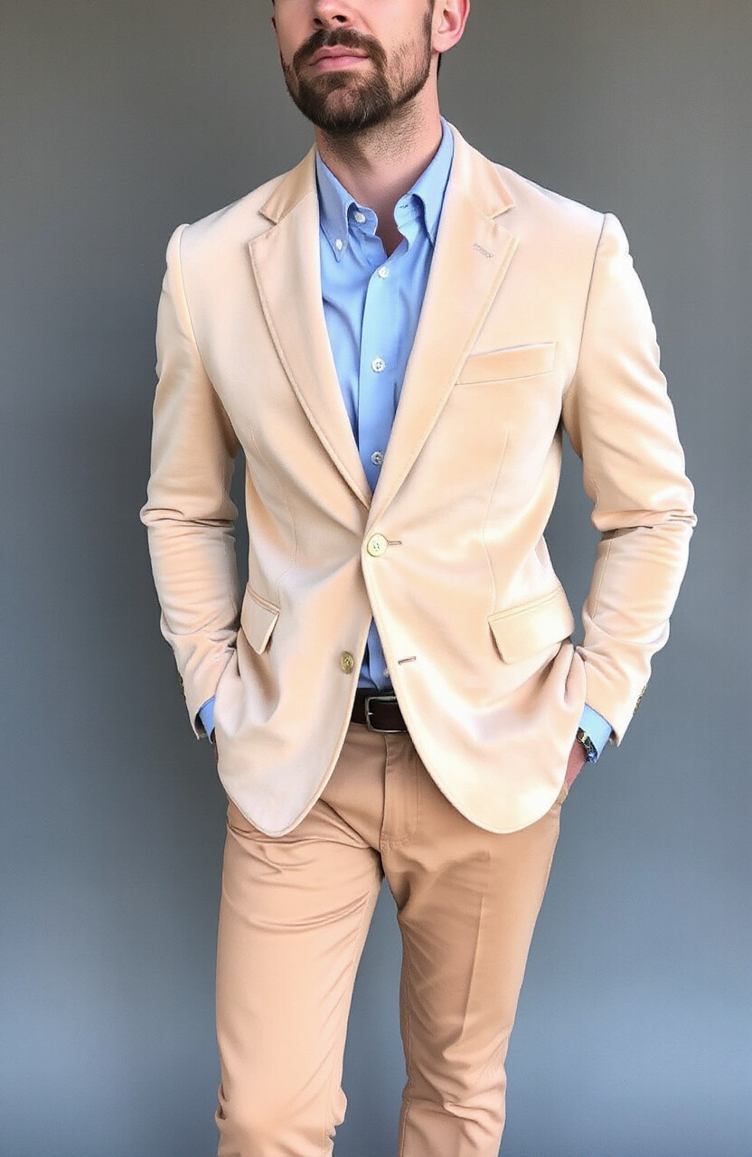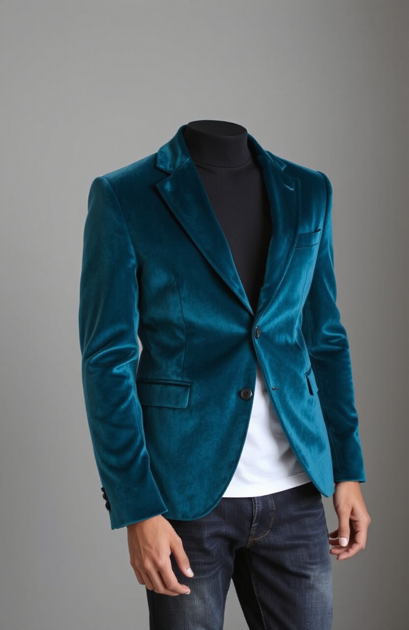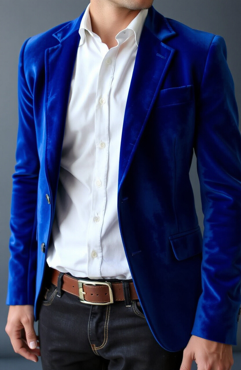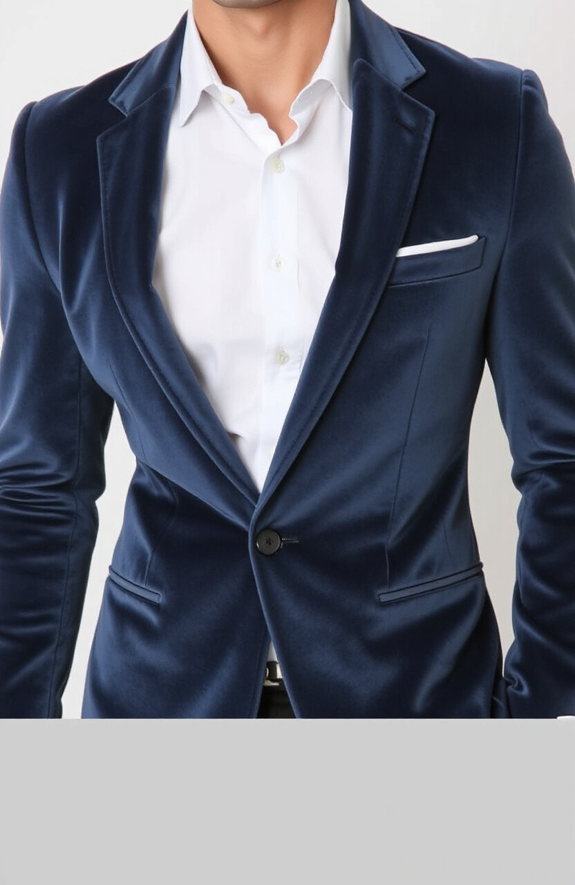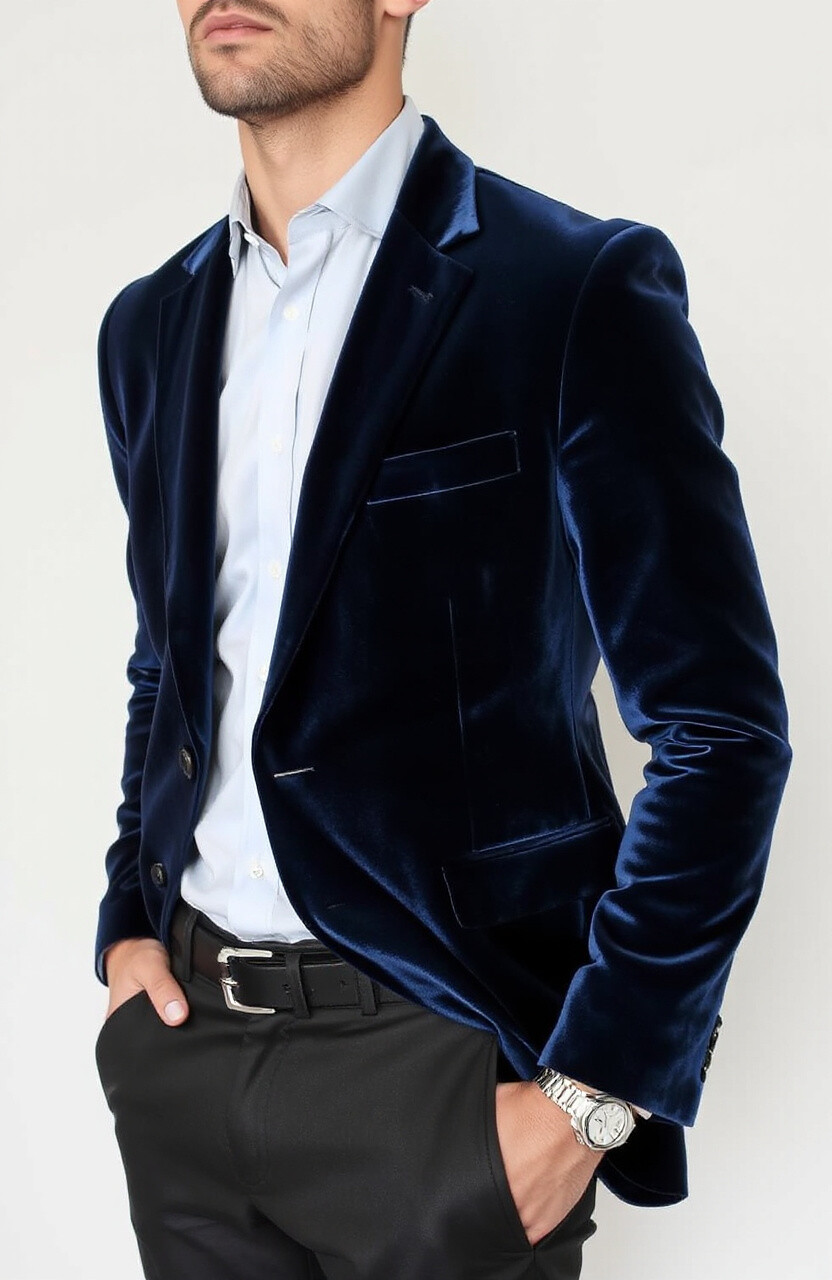 Picture yourself in a dark blue blazer that looks like the night sky. This color is perfect for adding a hint of mystery to your outfit. The soft velvet feels amazing, like a gentle hug.