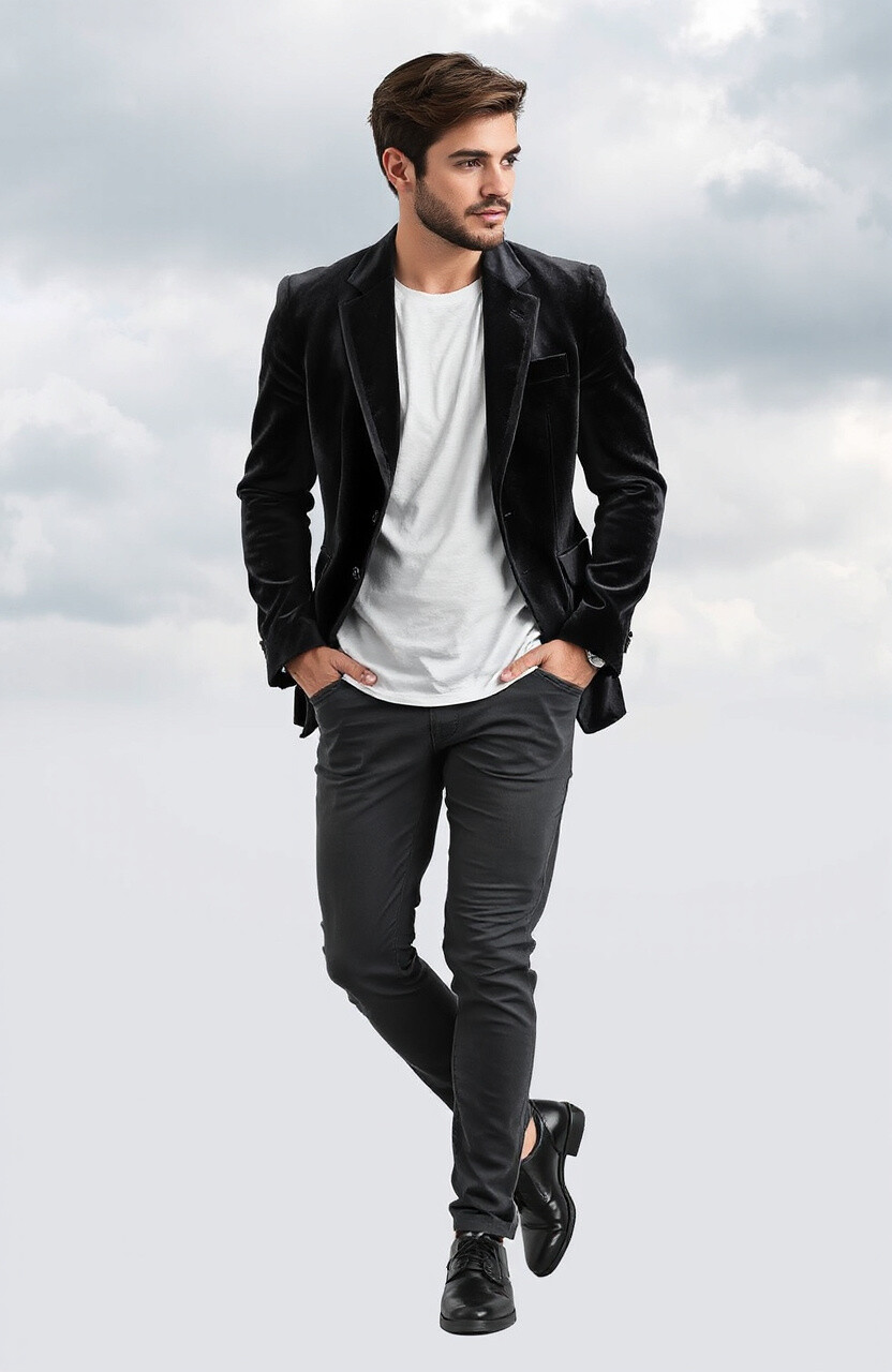 A black velvet blazer is a must-have. It’s like the little black dress of men’s fashion. Versatile and always in style.